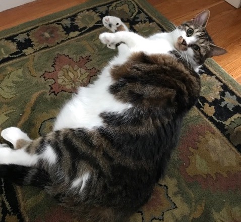 She was more friendly, at least to Cindy, probably because she fed her. Goldie had a habit of over-eating and then throwing up, so Cindy used a timed bowl to feed her small amounts several times a day. Goldie would sit impatiently watching for the bowl to rotate. But our portion control worked, and she got down to a much more respectable weight after a couple of years.