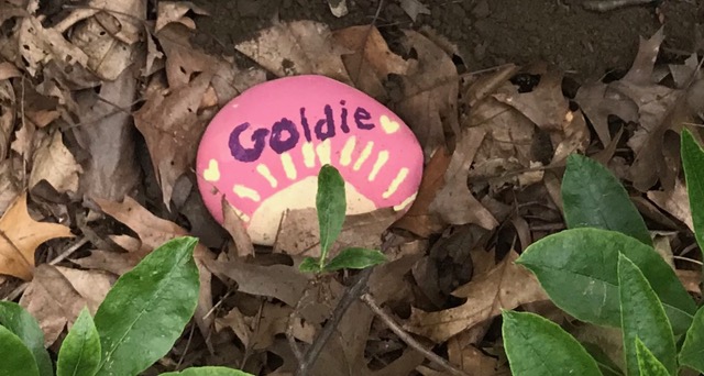 The coyotes returned the following night, but left only footprints to mark the reappearance. They searched for Goldie's body in vain, as she was now lying in state in her residence. True to their word, they didn't grab any chipmunks as a consolation prize. Mr Cardinal expressed his disappointment, but privately felt it was the coyotes' fault for a sloppy hit job. Not that he minded, as his wife's killer was now ready for a burial, although one that was more decorous than how his wife was laid to rest. We marked Goldie's grave with a stone generously painted by our neighbors' children, who would cat sit while we were away from home.