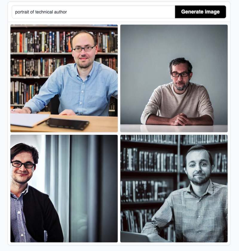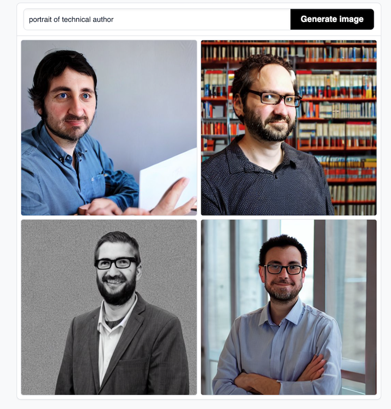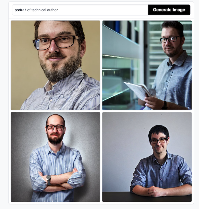 While working with my colleague Mike Mason on a forthcoming article, we asked Stable Diffusion to come up with portraits of technical authors. We thought the results were worth sharing.