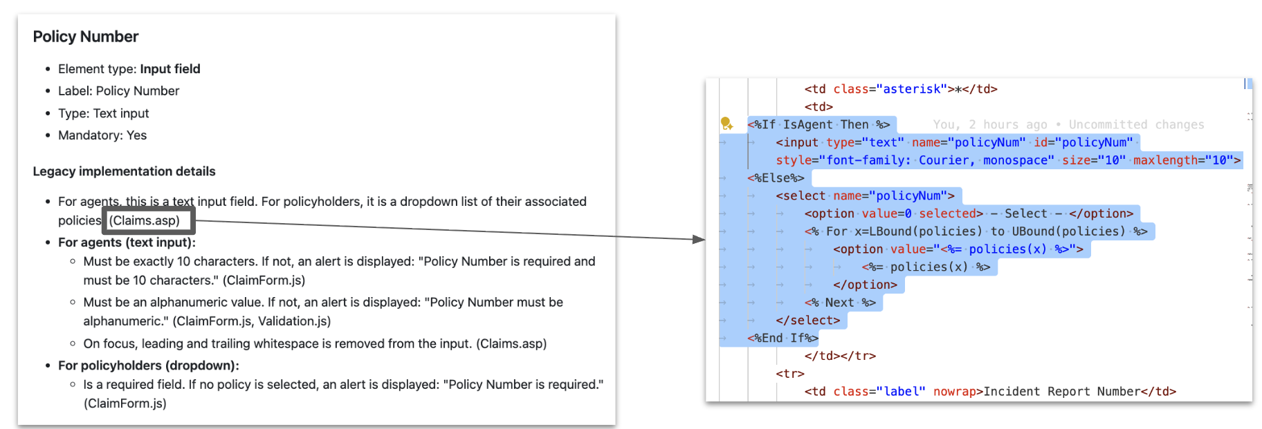 What we looked for: validation rules, navigation paths, hidden fields. One of the key challenges we faced from the early stage was hallucination, every step we added a detailed lineage to ensure that we cross check and confirm. In the above example we had the lineage of where it comes from. Following this pattern, for every key information we added the lineage along with the context. Here the LLM really sped up the summarizing of large numbers of screen definitions and consolidating logic from ASP and JS sources with the already identified UI layouts and field descriptions that would otherwise take weeks to create and consolidate.