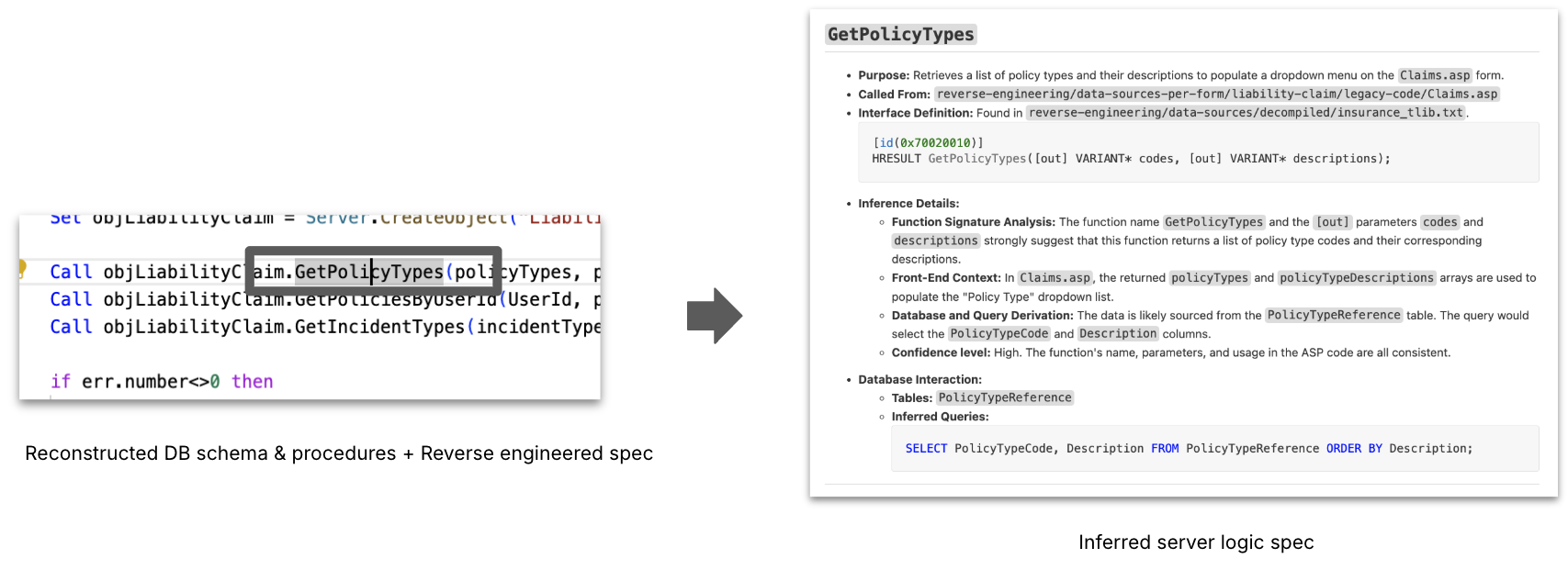 We then added more context by supplying typelibs that were extracted from the native binaries, and stored procedures, and schema extracted from the database. At this point with information about layout, presentation logic, and DB changes, the server logic can be inferred, which stored procedures are likely called, and which tables are involved for most methods and interfaces defined in the native binaries. This process leads to an Inferred Server Logic Spec. LLM helped in proposing likely relationships between App tier code and procedures / tables, which we then validated through observed data flows.