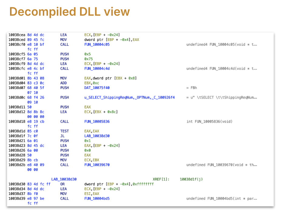 We didn't have to look at binary code of DLL. Tools like Ghidra help to decompile binary to a big set of ASM functions. Some of these tools even have the option to convert ASM into C code but we found that conversions are not always accurate. In our case decompilation to C missed a crucial lead.