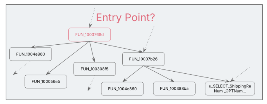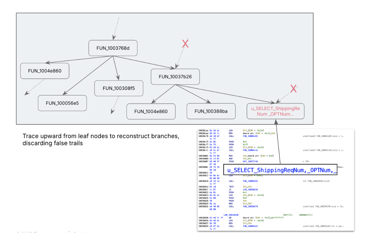 ASM code, and our disassembly tool, gave us the function call reference data, using it we walked up the tree, assuming the statement execution is one of the leaf functions, we navigated to the parent which called this to understand its context. At each step we converted ASM into pseudo code to build context.
