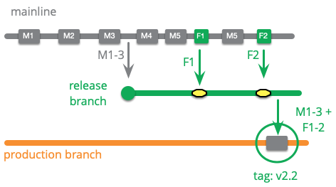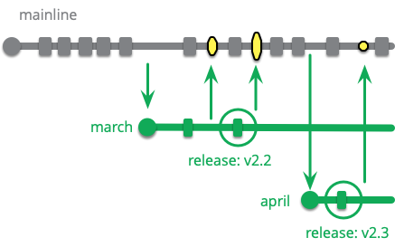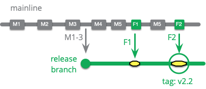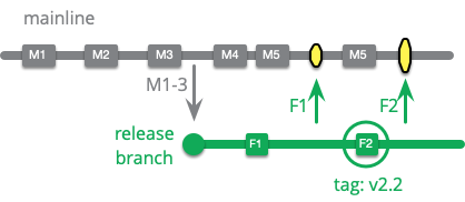 Similarly, if I want to create a new version of the product for release, I can start with the current mainline. If I need to fix bugs to make the product stable enough for release, I can use a Release Branch.