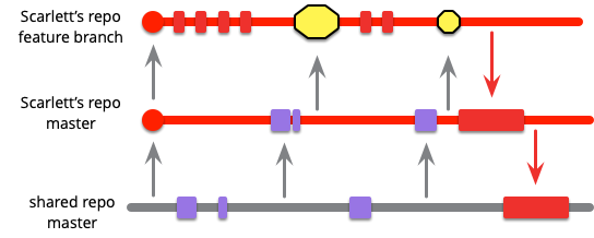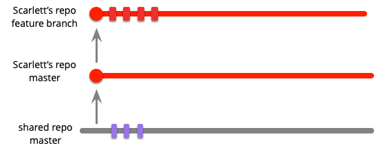 Some teams like to ensure all code, whether integrated or not, is kept in the central repository. In this case Scarlett would push her feature branch into the central repository. This would also allow other team members to see what she's working on, even if it's not integrated into other people's work yet.
