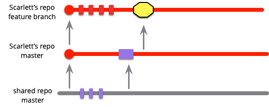 I've marked the merge with the yellow box. This one merges commits S1..3 with M1. Soon Violet needs to do the same thing.