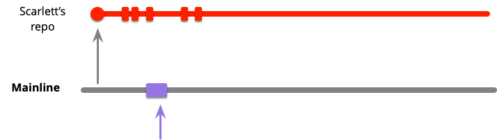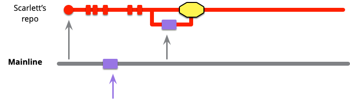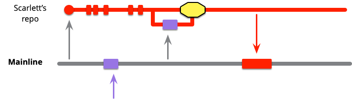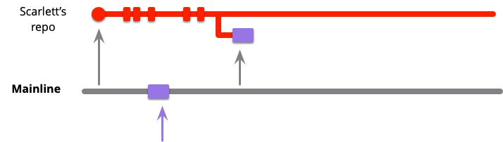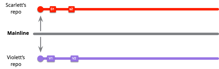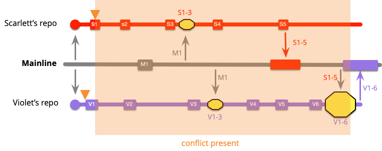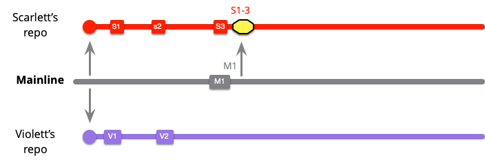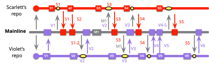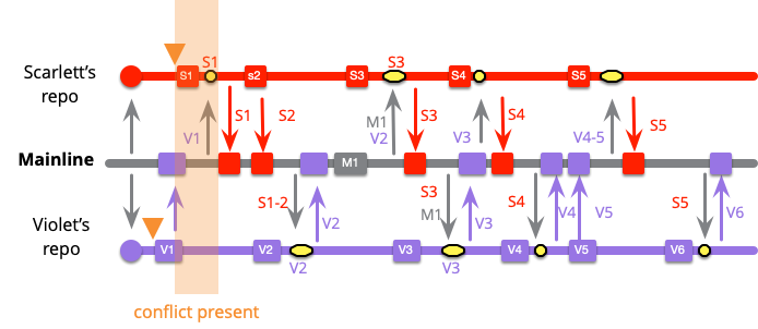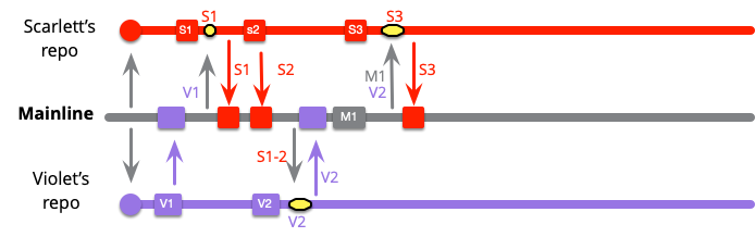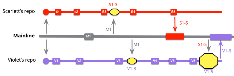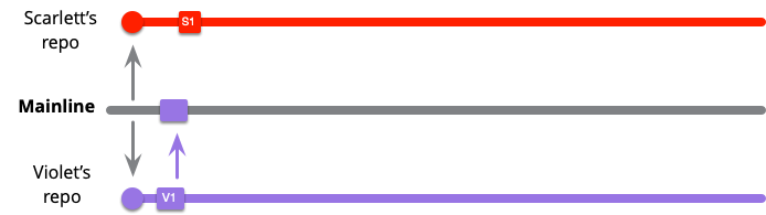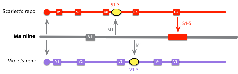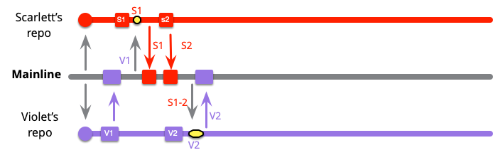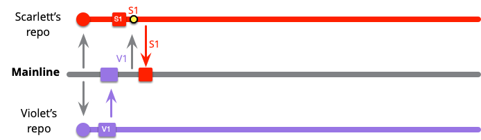Scarlett's first commit also has mainline integration, but because Violet got there first, she needs do a merge. But since she's only merging V1 with S1, the merge is small.