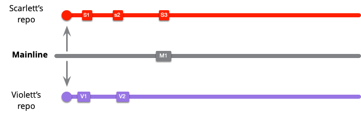 At this point both developers are up to date with mainline, but they haven't integrated since they are both isolated from each other. Scarlett is unaware of any changes Violet has made in V1..3.