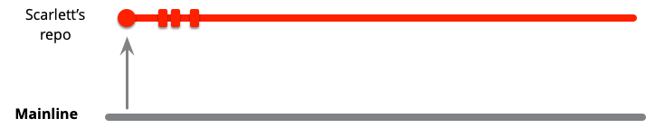 For example, let's follow Scarlett. She would pick up the feature to add collection of local sales taxes to their website. She begins with the current stable version of the product, she'll pull mainline into her local repository and then create a new branch starting at the tip of the current mainline. She works on the feature for as long as it takes, making a series of commits to that local branch.