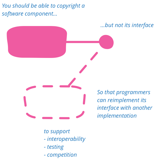 The original lawsuit was brought by Oracle against Google, claiming that Oracle held a copyright on the Java APIs, and that Google infringed these APIs when they built Android. My support in this brief has nothing to do with the details of the dispute between these two tech giants, but everything to do with the question of how intellectual property law should apply to software, particularly software interfaces.