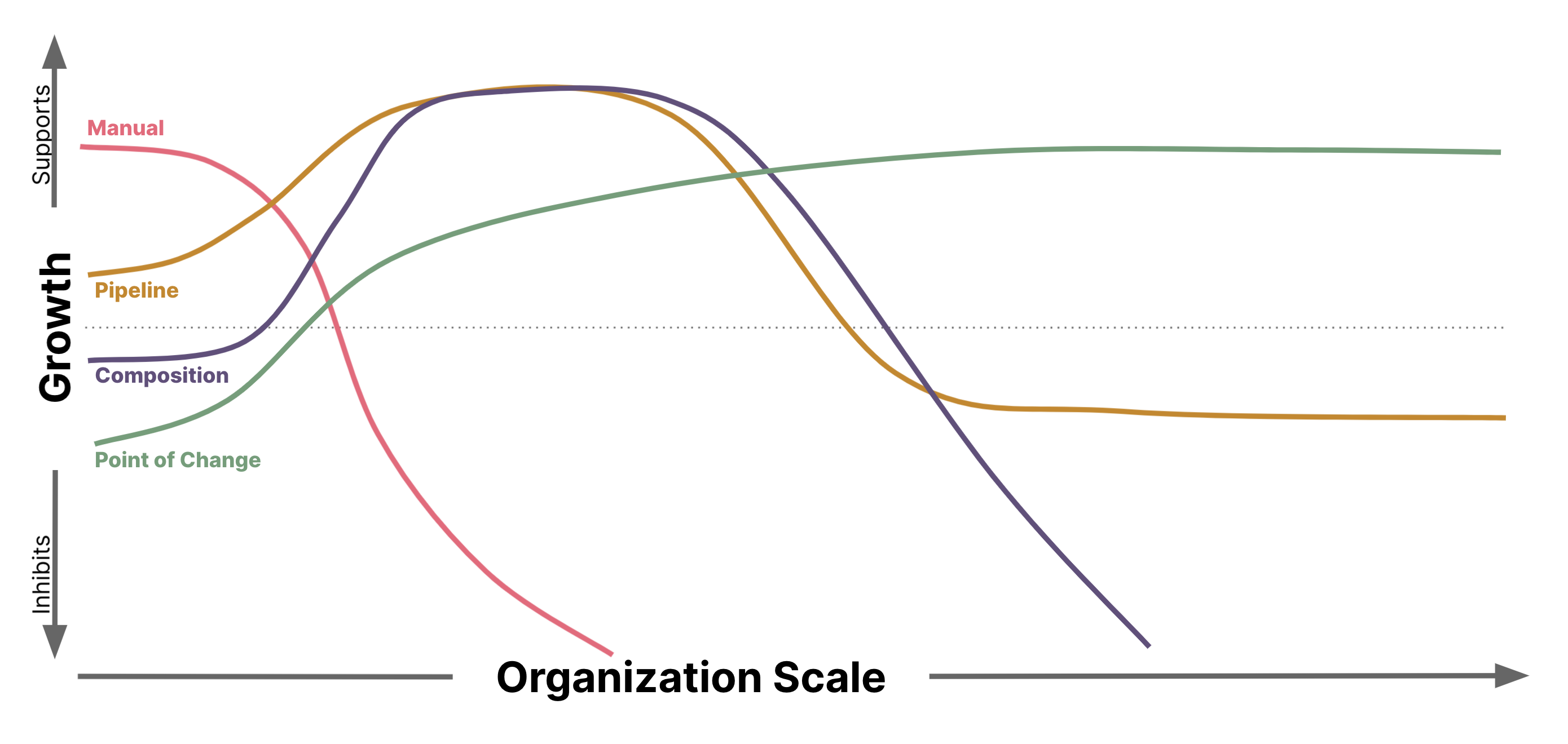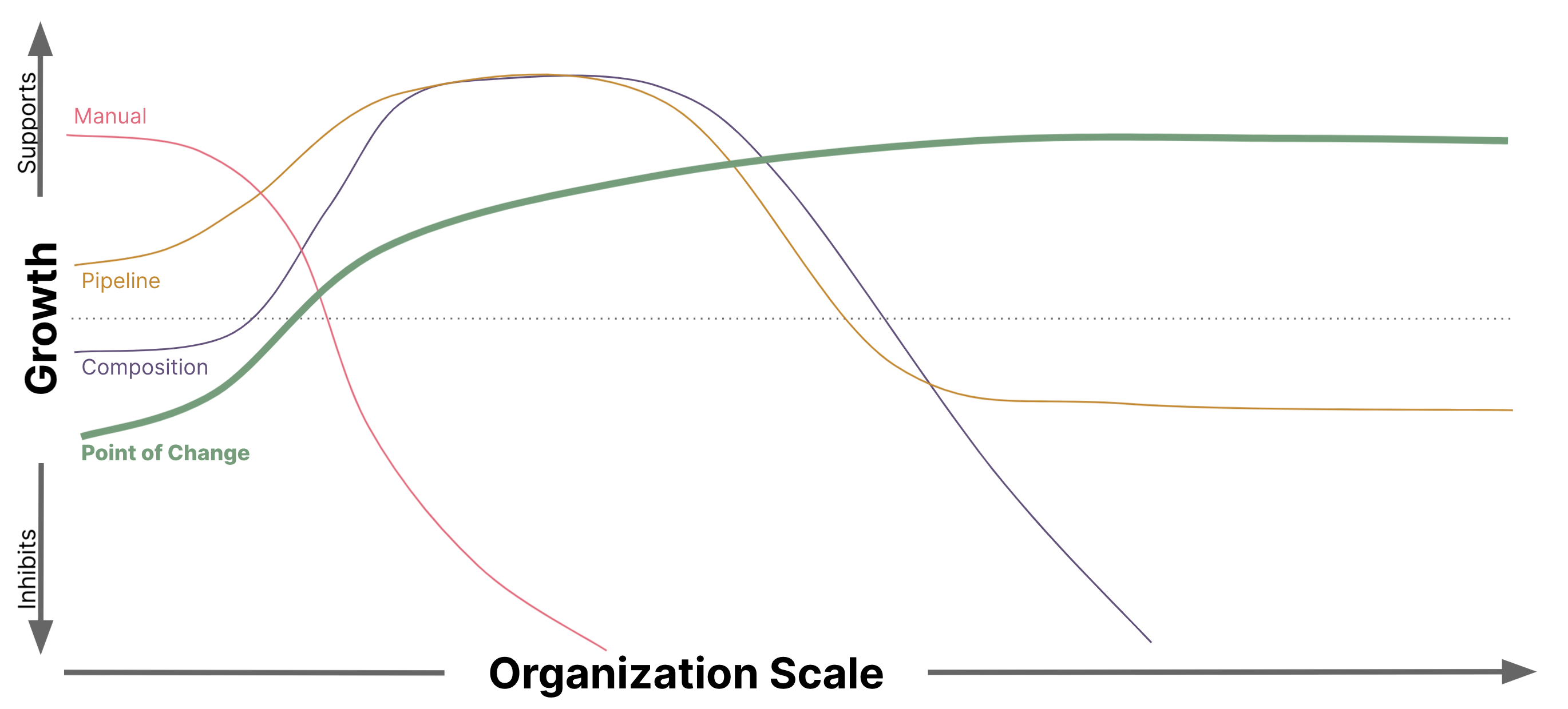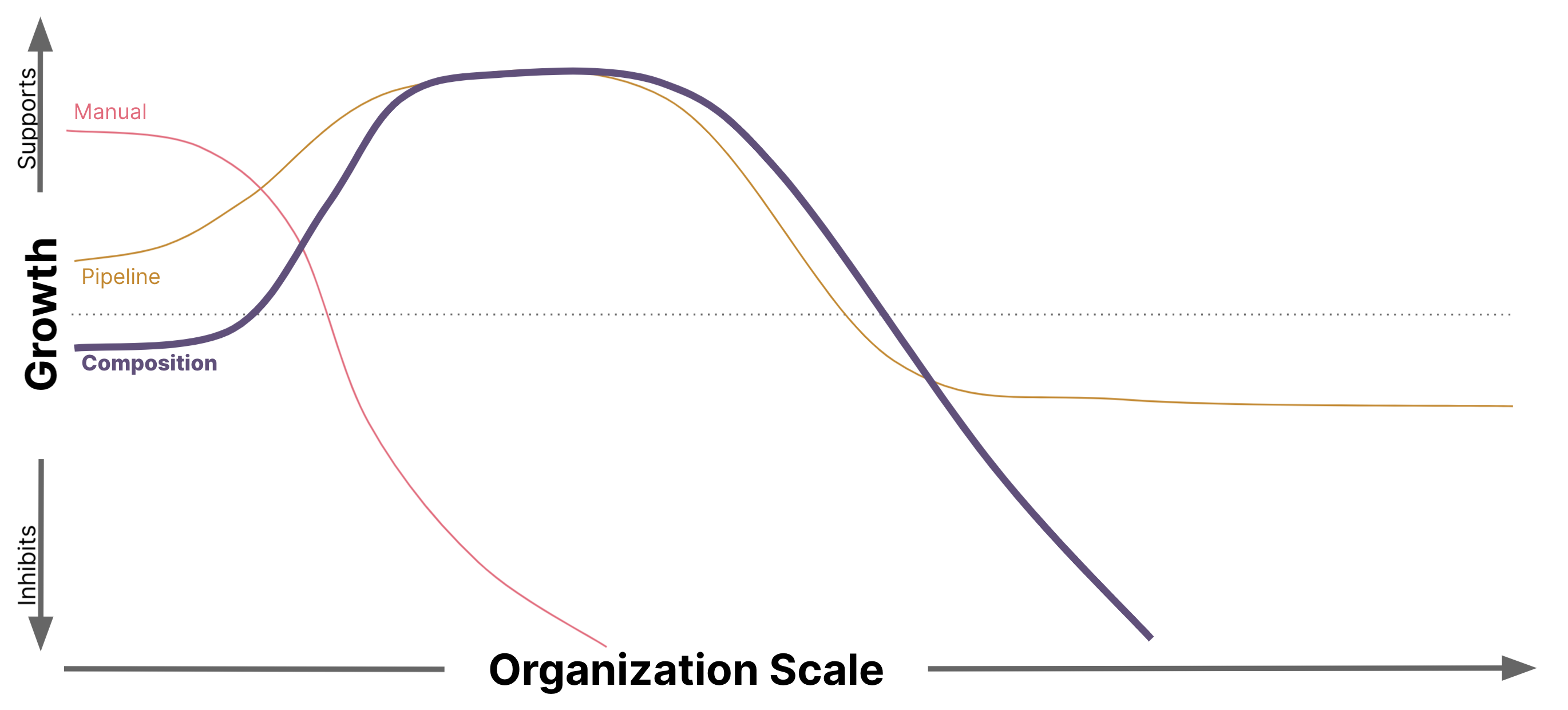 As the component-composition solution shows its inefficiency at scale, it also starts to become the limiting factor in how quickly development teams can deliver business value. The second-order effects are similar to the manual and pipeline-based solutions: “shadow IT”, compromised design and architecture decisions, or deploying to production components which have not passed Compliance requirements.