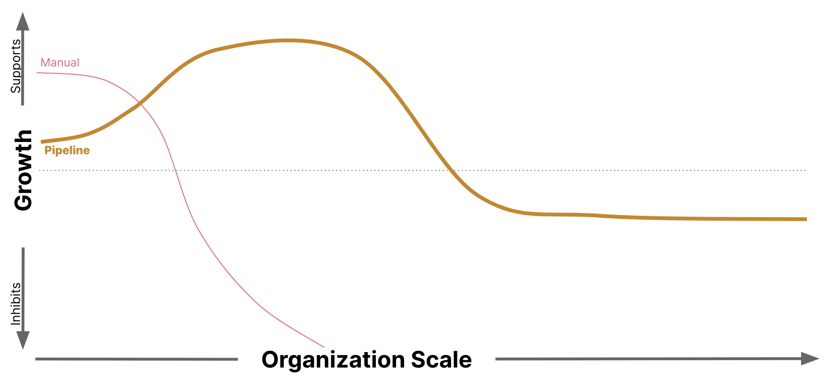 The level of friction created over time is hard to understate. The primary reason for a pipeline to exist is to provide a central tool in the software development process. When it is co-opted and then controlled for orthogonal goals, the developer concerns tend to drift down in prioritization based on the way the pipeline team (often the DevOps team) is staffed, organized, incentivized and operationalized.