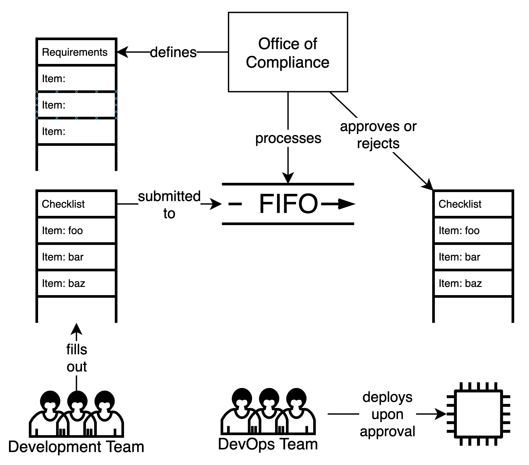 If the Office of Compliance becomes overloaded (for any reason), then the queue of teams waiting for Compliance results grows - the compliance process itself is a bottleneck limiting value delivery. Quite often, the pressure of delivery overwhelms the Compliance process, and development teams actively abuse, subvert, or avoid the Compliance process altogether, resulting in “shadow IT”, compromised design and architecture decisions, or even falsifying Compliance responses.