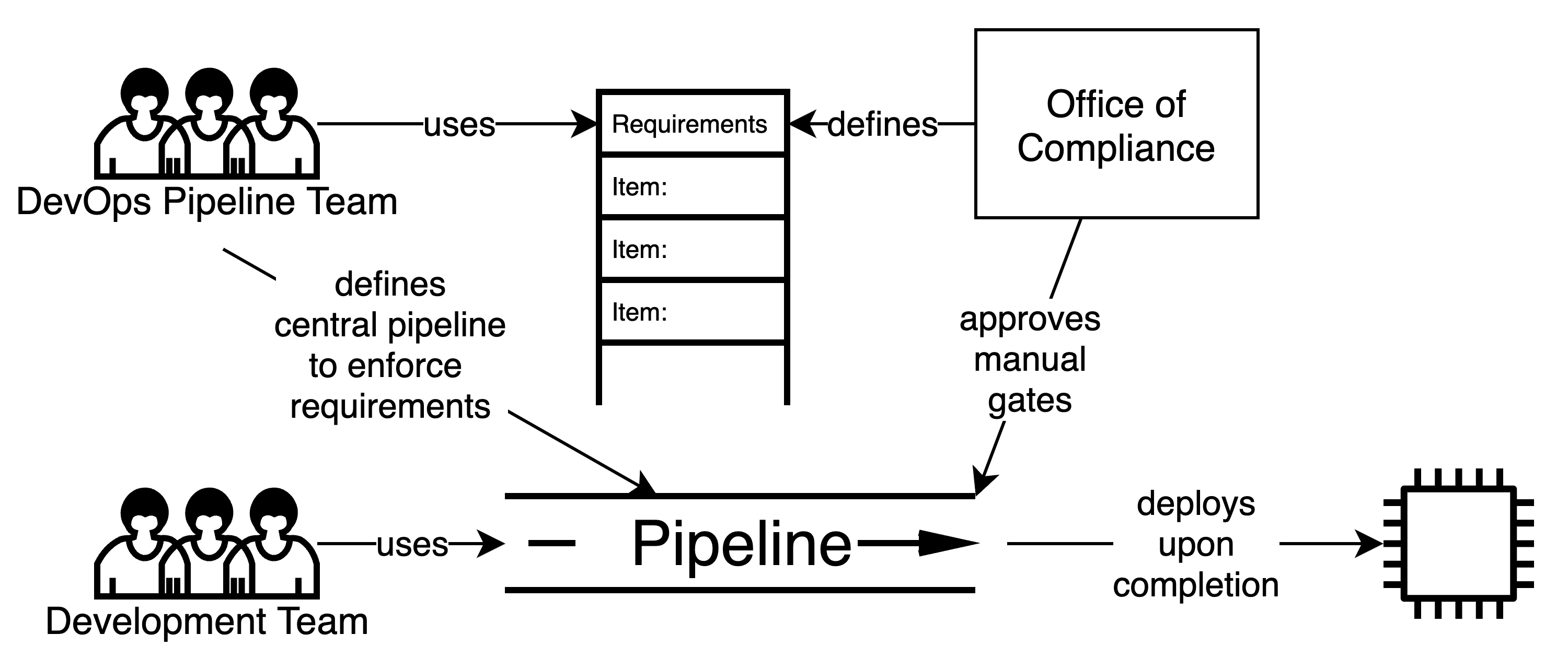 In this way, successfully executing the pipeline implicitly proves that the system release has met the automatically verifiable Compliance requirements which are built into the pipeline. Passing the manual gates between pipeline stages explicitly indicates that the manually verifiable Compliance requirements have also been met.