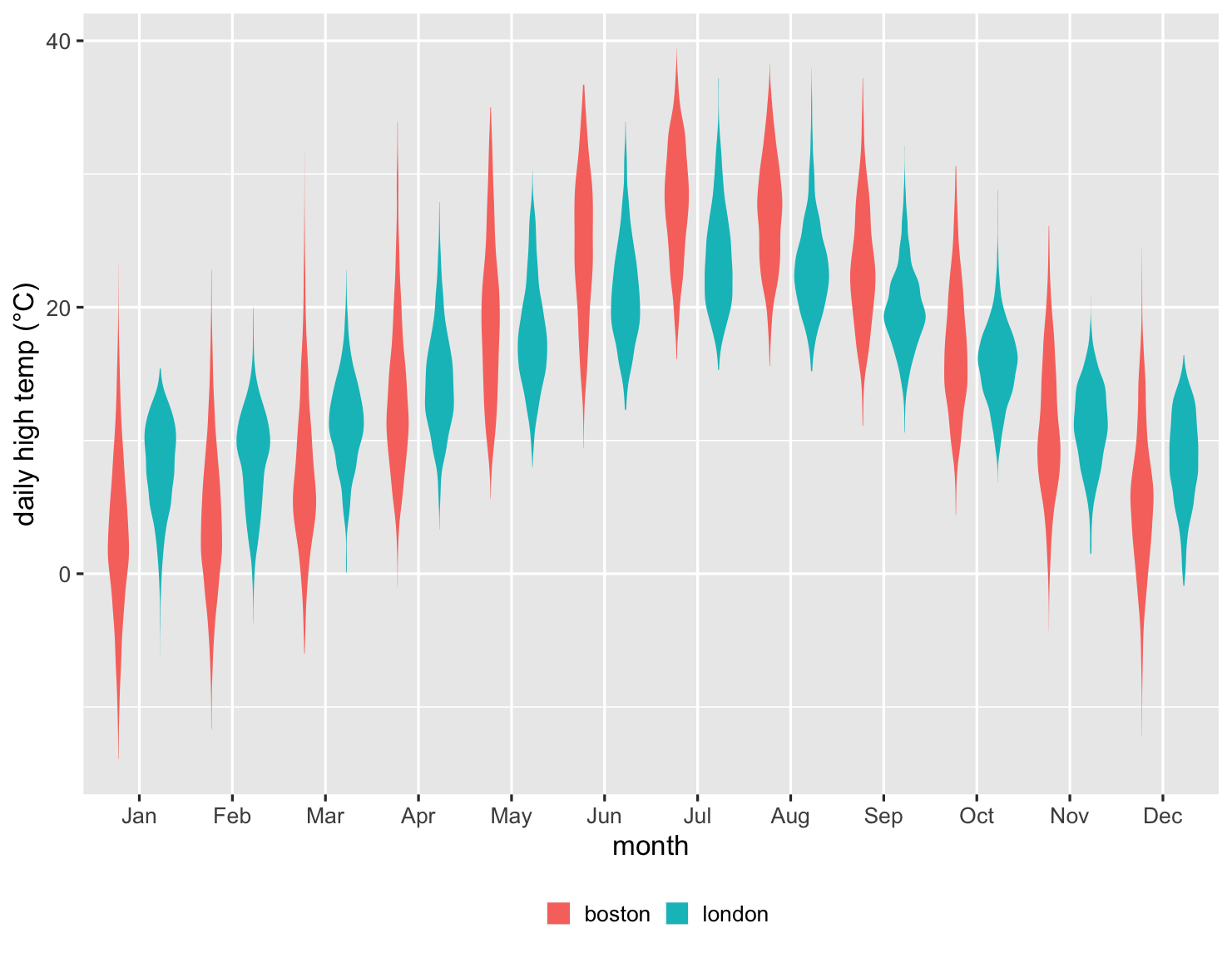 ggplot(temps, aes(month, high_temp, fill=factor(city))) + ylab(label = "daily high temp (°C)") + theme_grey(base_size=20) + labs(fill = NULL) + scale_x_discrete(labels=month.abb) + theme(legend.position = "bottom") + geom_violin(color = NA)