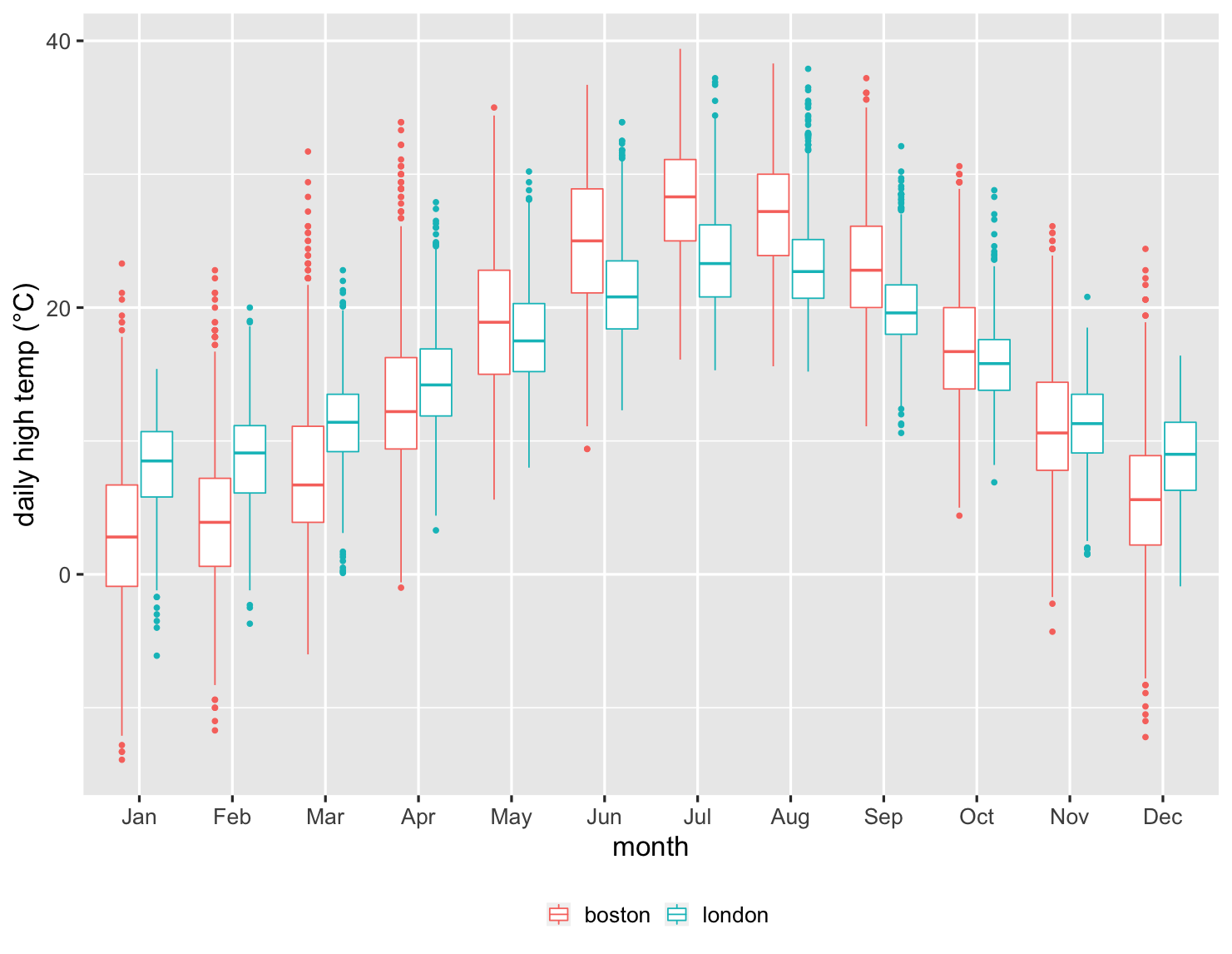 ggplot(temps, aes(month, high_temp, color=factor(city))) + ylab(label = "daily high temp (°C)") + theme_grey(base_size=20) + scale_x_discrete(labels=month.abb) + labs(color = NULL) + theme(legend.position = "bottom") + geom_boxplot()
