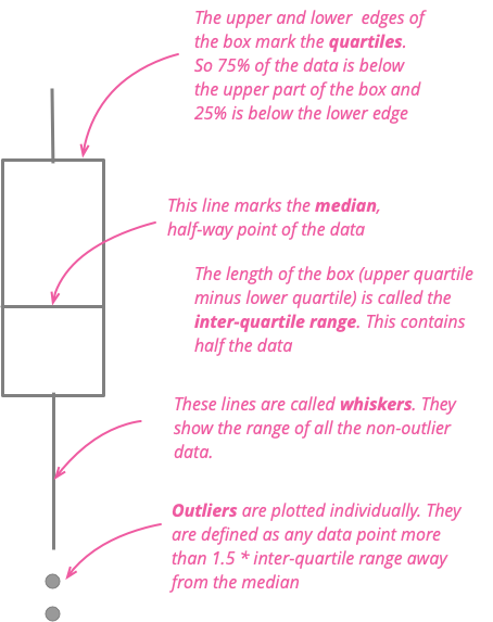 Histograms and density plots are a good way to compare different shapes of distributions, but once I get beyond a handful of graphs then they become difficult to compare. It's also useful to get a sense of commonly defined ranges and positions within the distribution. This is where the boxplot comes in handy.