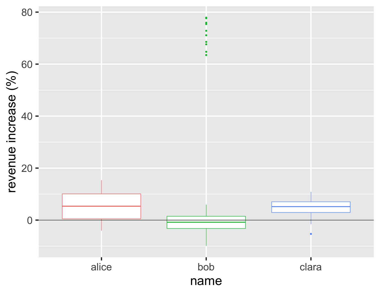 The box plot focuses our attention on the middle range of the data, so that half the data points are within the box. Looking at the graph we can see more than half of Bob's accounts shrank and that his upper quartile is below Clara's lower quartile. We also see his cluster of hot accounts at the upper end of the graph.
