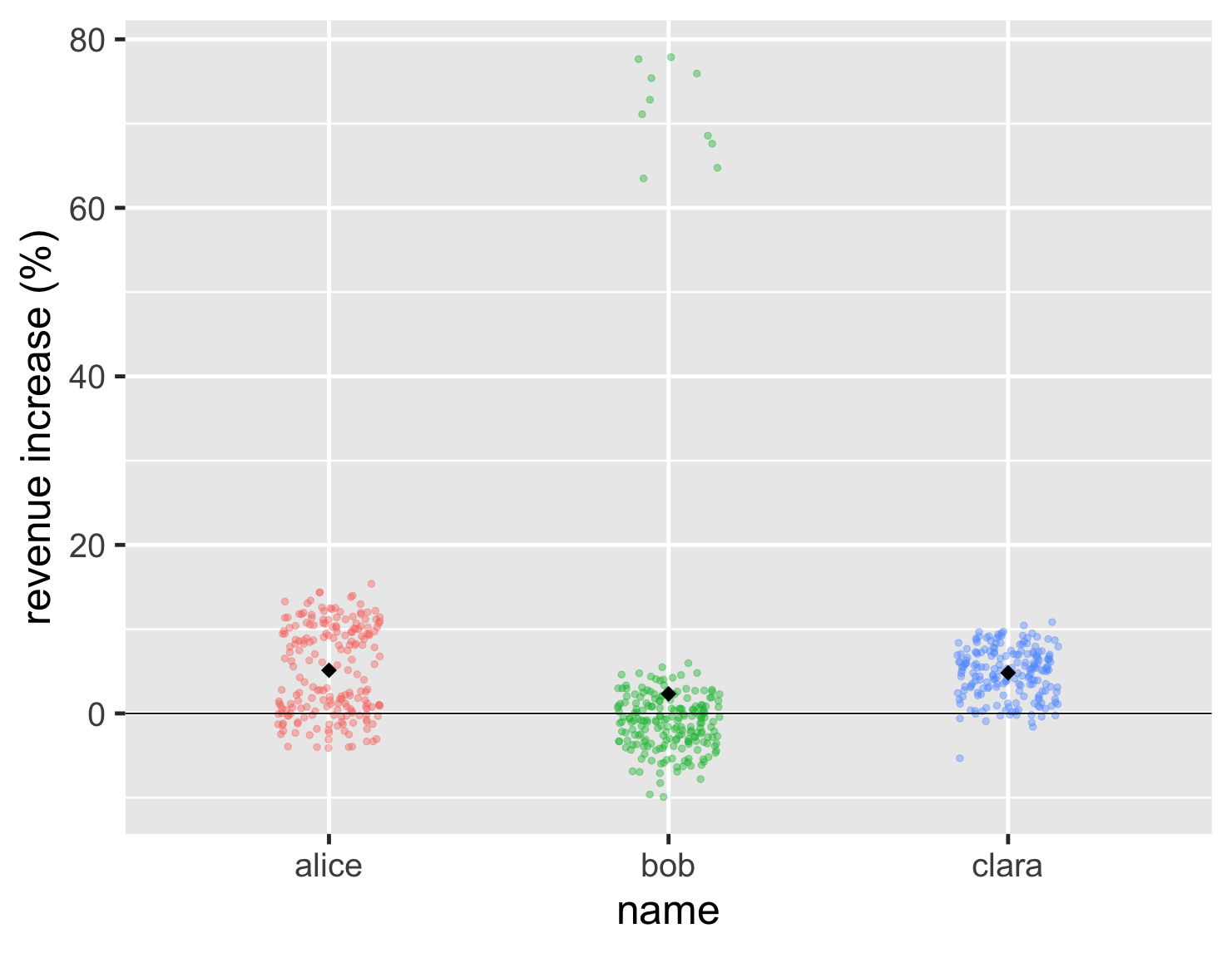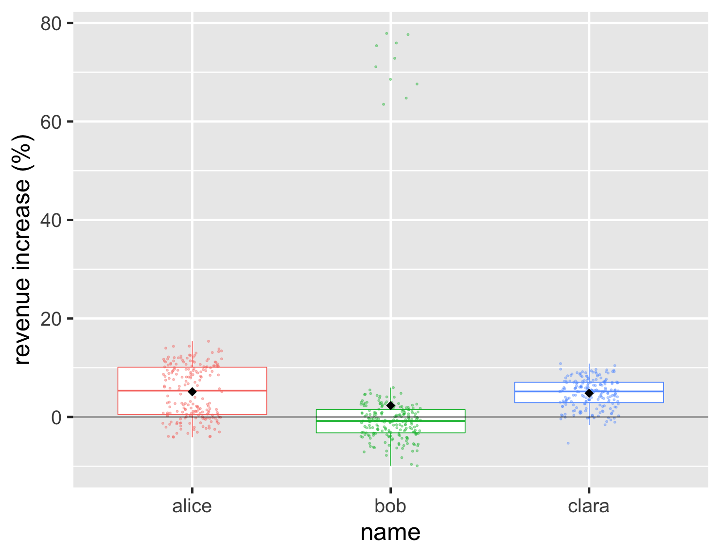 This allows me to show both the underlying data, and the important aggregate values. In this plot I also included the black diamond that I used before to show the position of the mean. This is a good way to highlight cases like Bob where the mean and median are quite different.