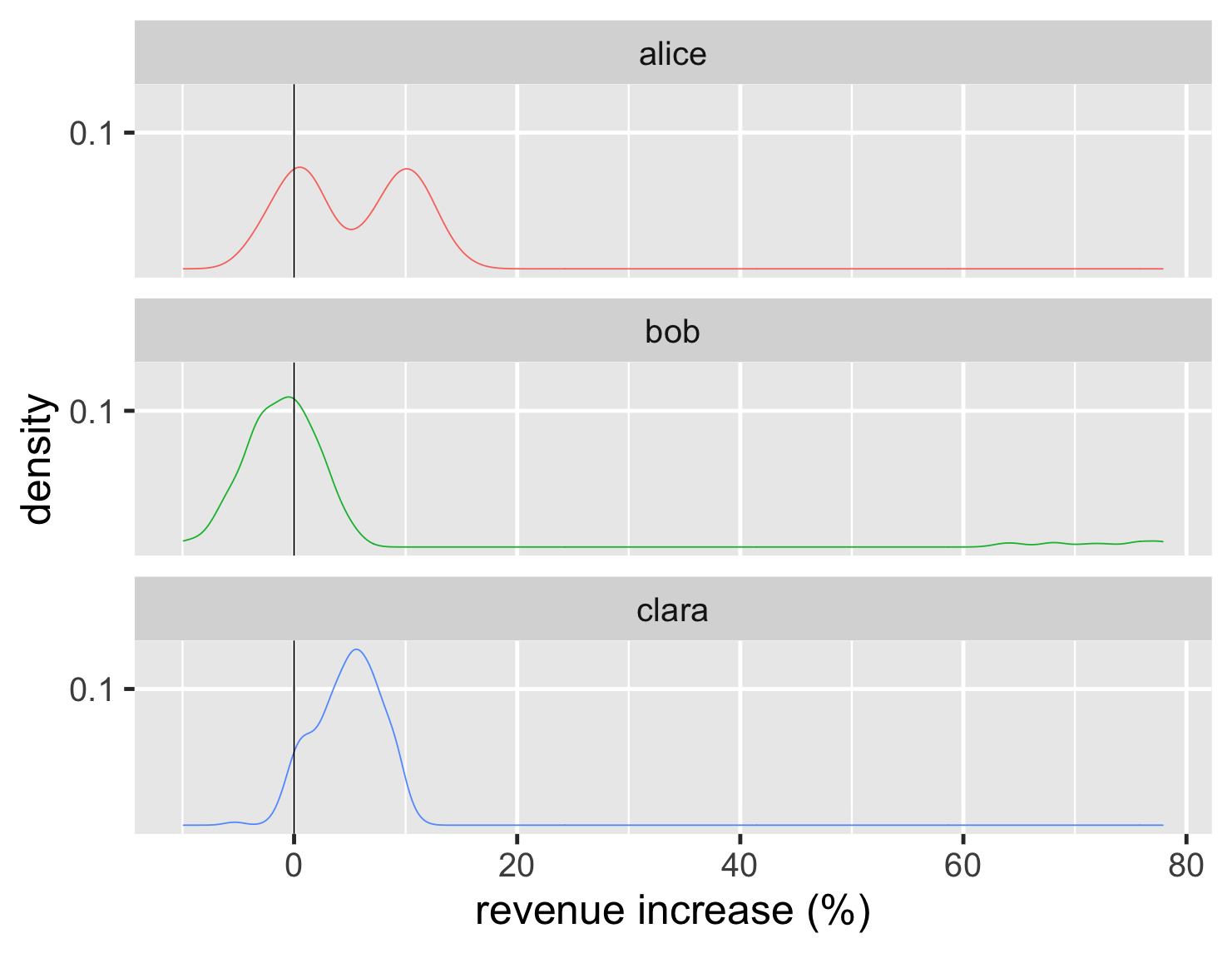 ggplot(large_sales, aes(value, color=name)) + geom_density(show.legend=FALSE) + geom_vline(xintercept = 0) + xlab(label = "revenue increase (%)") + scale_y_continuous(breaks = c(0.1)) + theme_grey(base_size=30) + facet_wrap(~ name,ncol=1)