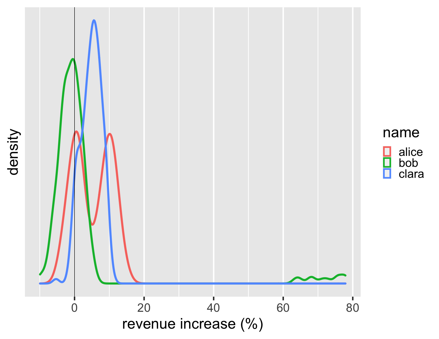 ggplot(large_sales, aes(value, color=name)) + geom_density(size=2) + scale_y_continuous(breaks = NULL) + xlab(label = "revenue increase (%)") + geom_vline(xintercept = 0) + theme_grey(base_size=30)