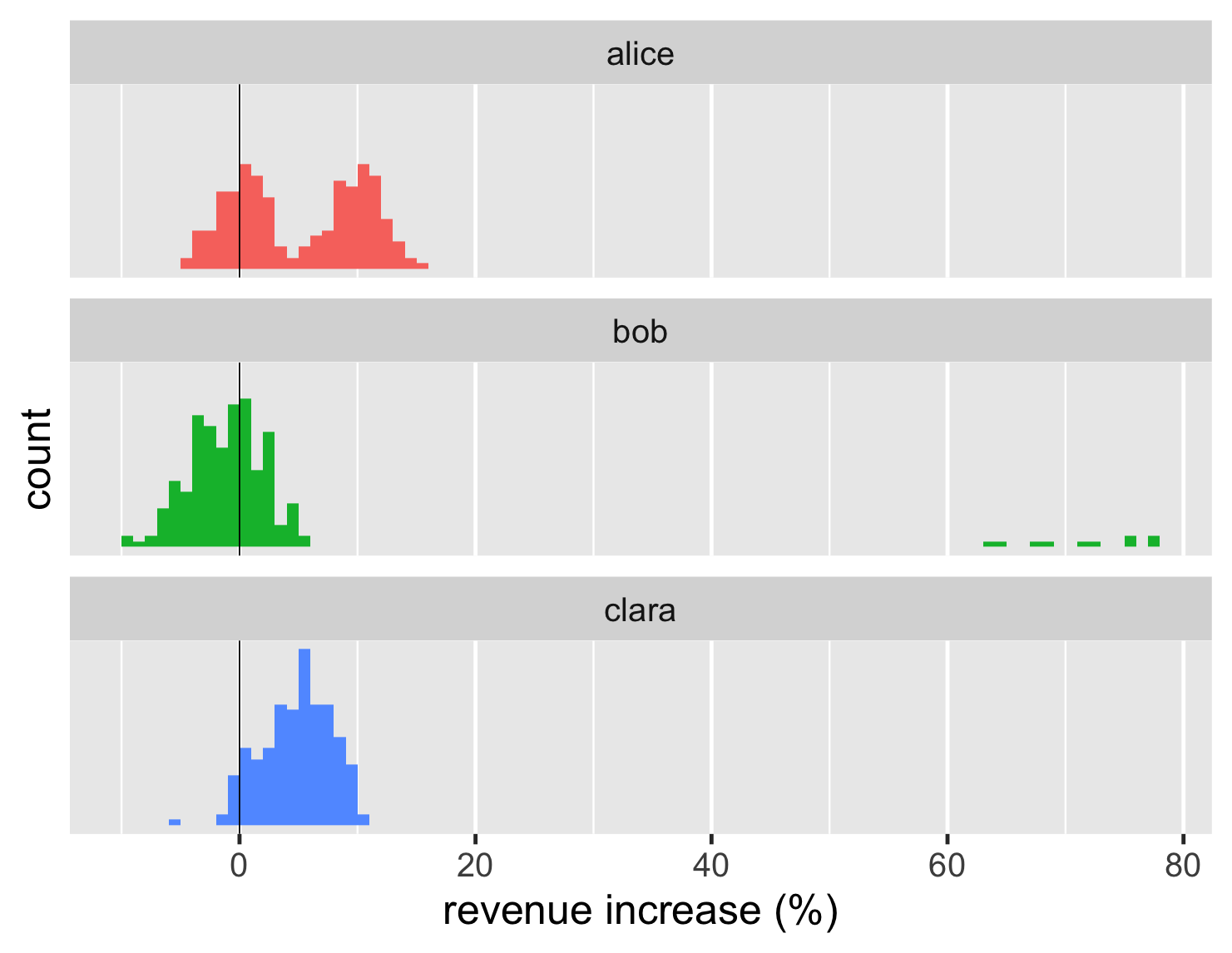 ggplot(large_sales, aes(value, fill=name)) + geom_histogram(binwidth = 5, boundary=0,show.legend=FALSE) + scale_y_continuous(breaks = c(50,100)) + xlab(label = "revenue increase (%)") + geom_vline(xintercept = 0) + theme_grey(base_size=30) + facet_wrap(~ name,ncol=1)