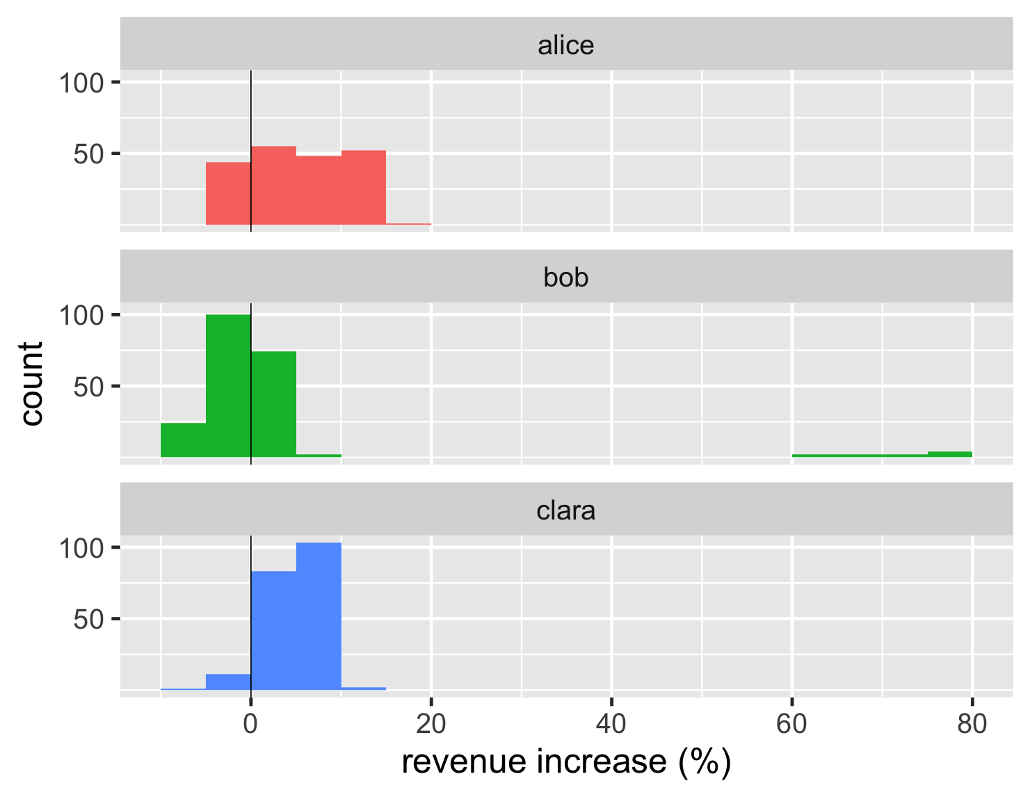 ggplot(large_sales, aes(value, fill=name)) + geom_histogram(binwidth = 1, boundary=0, show.legend=FALSE) + xlab(label = "revenue increase (%)") + scale_y_continuous(breaks = c(50,100)) + geom_vline(xintercept = 0) + theme_grey(base_size=30) + facet_wrap(~ name,ncol=1)