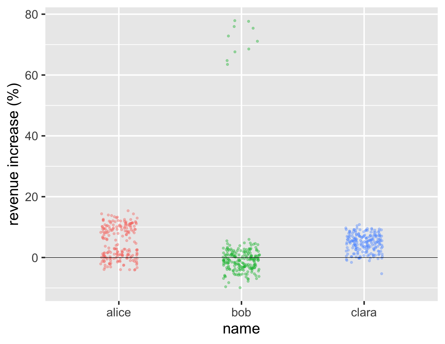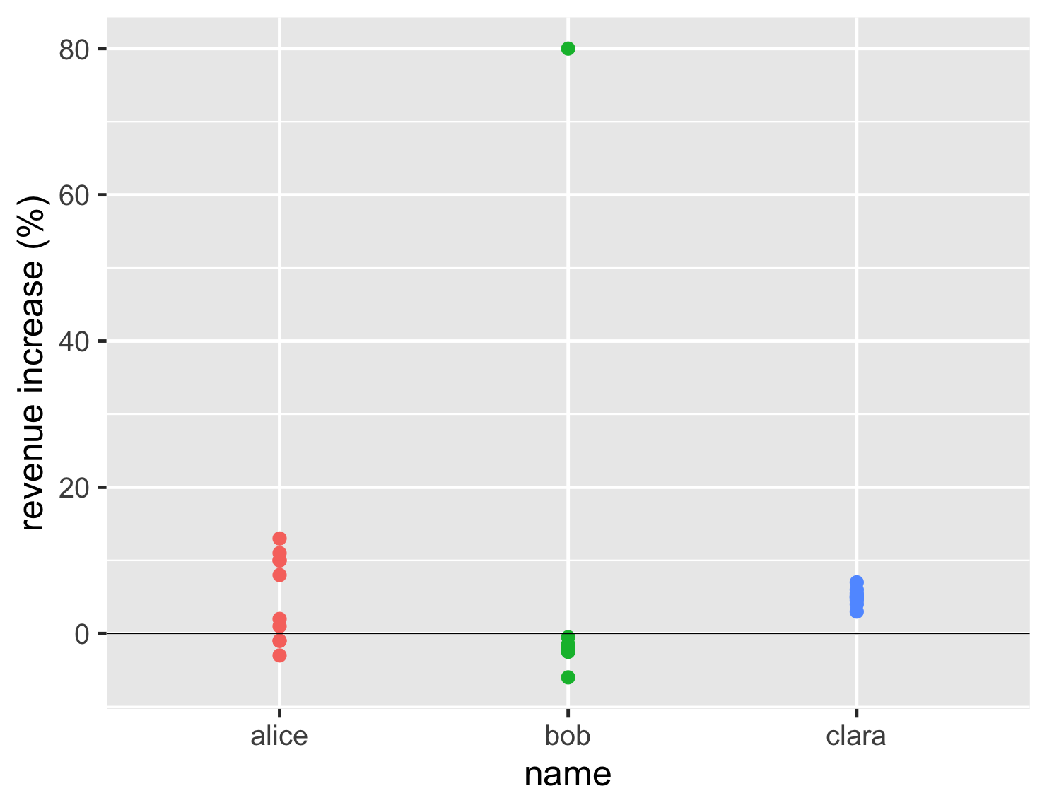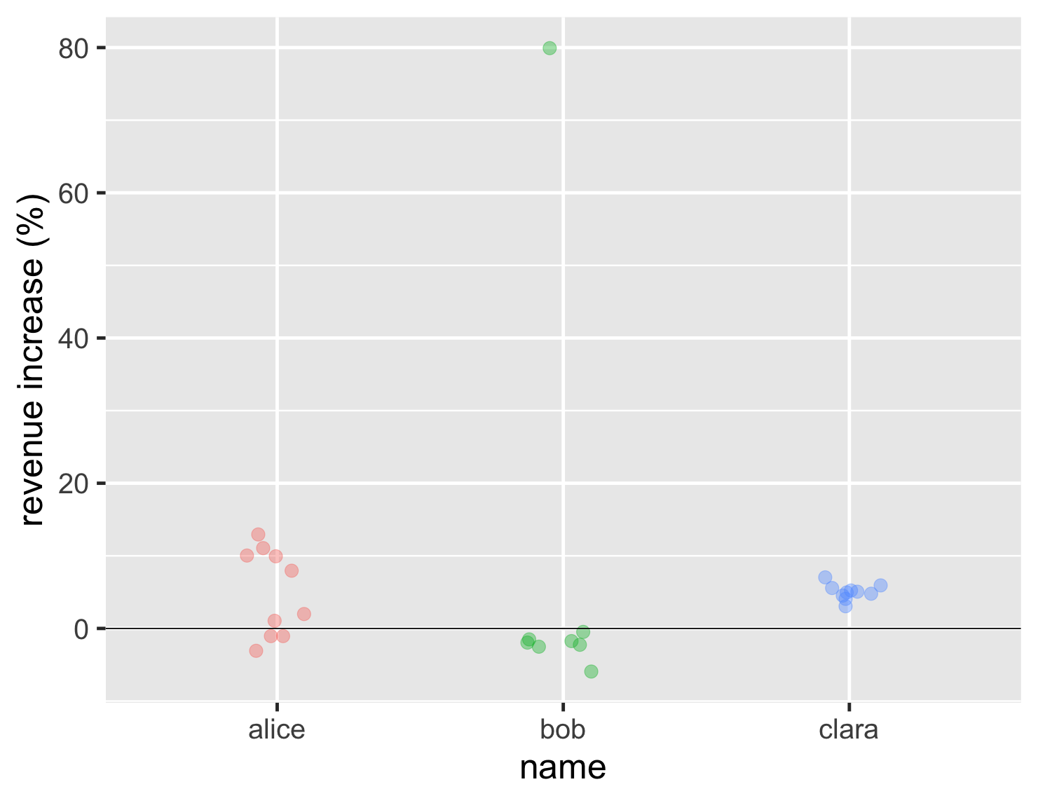 This plot is still better than that first bar chart, as it clearly indicates how Bob's outlier is different to his usual performance. But with Clara having so many similar values, they all clump on top of each other, so you can't see how many there are.