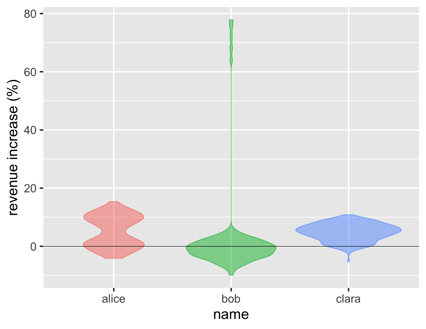 This has the advantage of showing the shape of the distribution clearly, so the double peak of Alice's performance stands right out. As with density plots, they only become effective with a larger number of points. For the sales example, I think I'd rather see the points in the box, but the trade-off changes if we have 27,000 temperature measurements.