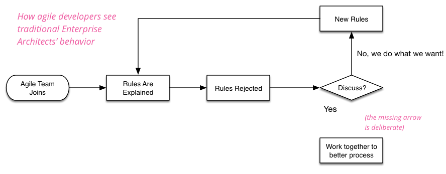 If you are an Enterprise Architect (EA) in an organization transitioning to lean or agile practices, you may be feeling a bit lost. You have worked hard to get where you are. You probably wrote most of the critical system software keeping your enterprise running. You helped implement and maybe even designed the architecture. You know some of it is older technology and a bit fragile, but with too few resources and too little time, compromises have to be made. In fact, your own ability to keep up with the latest trends have suffered because only you know how to keep things working. To help manage time, you have implemented universal standards and tried to funnel requests to architecture review boards or other planned meetings. Developers routinely work around the system, complaining that process holds them back, but you know that these things are there for the good of the company so you reinforce the policy to try to keep control.