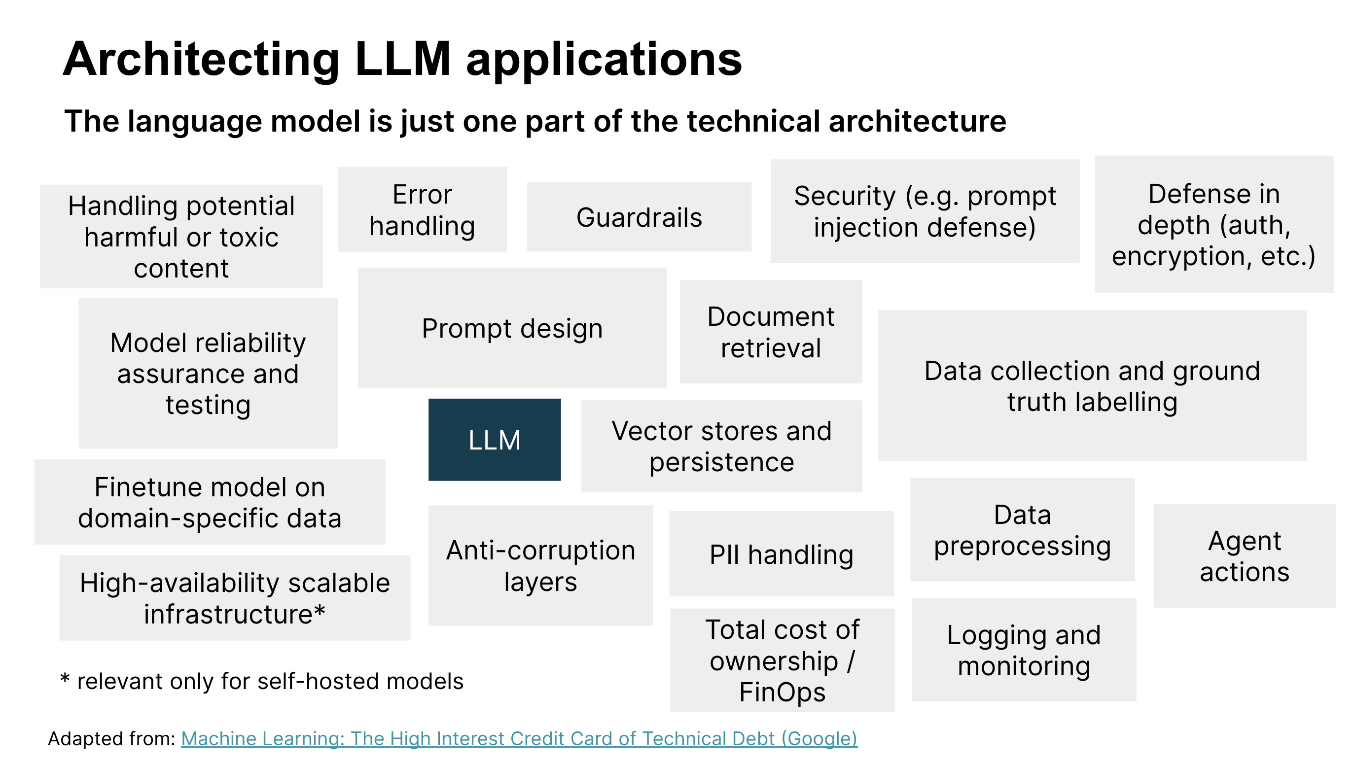 Figure 3: Technical considerations for designing and deploying LLM applications. Image adapted from: Machine Learning: The High Interest Credit Card of Technical Debt (Google)