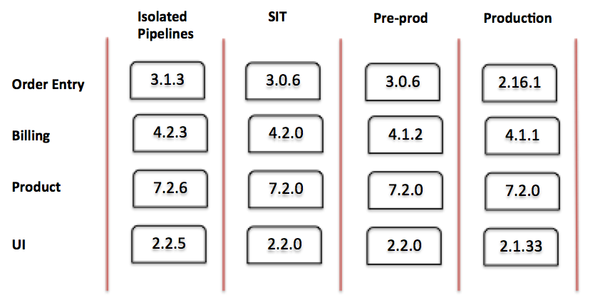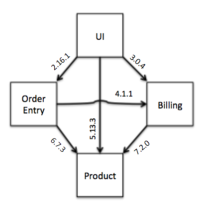 An important corollary to the definition of a logical environment is the notion of cohesion - each environment should have only one instance of a given service. Unfortunately, in large projects where each team moves at a different pace, it is all too easy to run into the classic diamond dependency problem usually associated with compile time dependencies:
