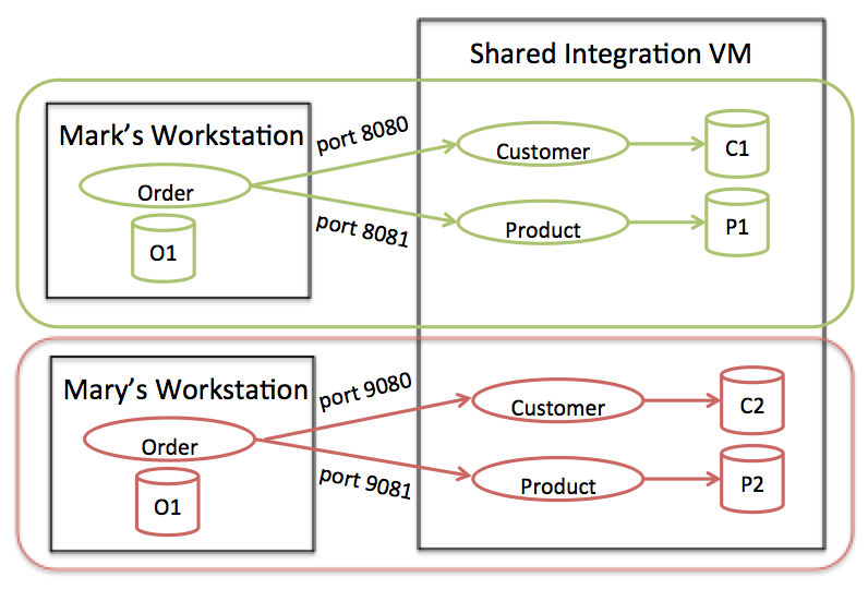 The components needed to satisfy a development need may be quite different for the various teams and roles than the components needed to satisfy a business need. Few developers in large organizations expect to run an isolated full-stack environment, and isolation should go only as far as needed to make developers productive. For example, in a retail project, a developer in the order entry team may require services for the product catalog and customer management, but perhaps not for warehouse management. In production, each of those may have a load-balanced cluster supporting them, but developers and QAs value isolation over performance and availability. In the extreme case, different developers may have different logical environments on the same VM. In this case, the isolation can be accomplished by making ports and database names part of the environment configuration.