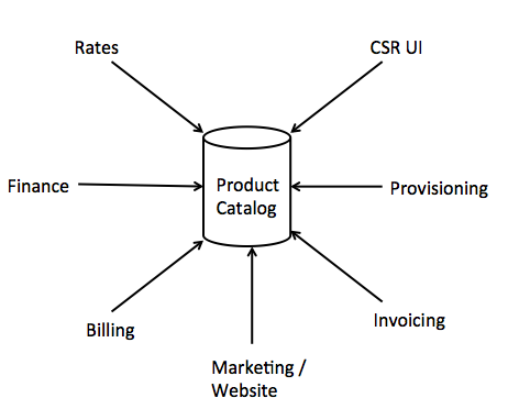 Let's look at an example of a product catalog. In the legacy system, one team entered new product codes and their associated rates. A provisioning team used another tool to enter appropriate configuration, such as the codes downstream phone provisioning systems needed, and the service codes to turn on TV channels in another application. The finance team entered general ledger information about the product in their financial tool, and the invoicing team added special invoicing rules in yet a different application. The communication between these teams was managed by the business, not by technology.