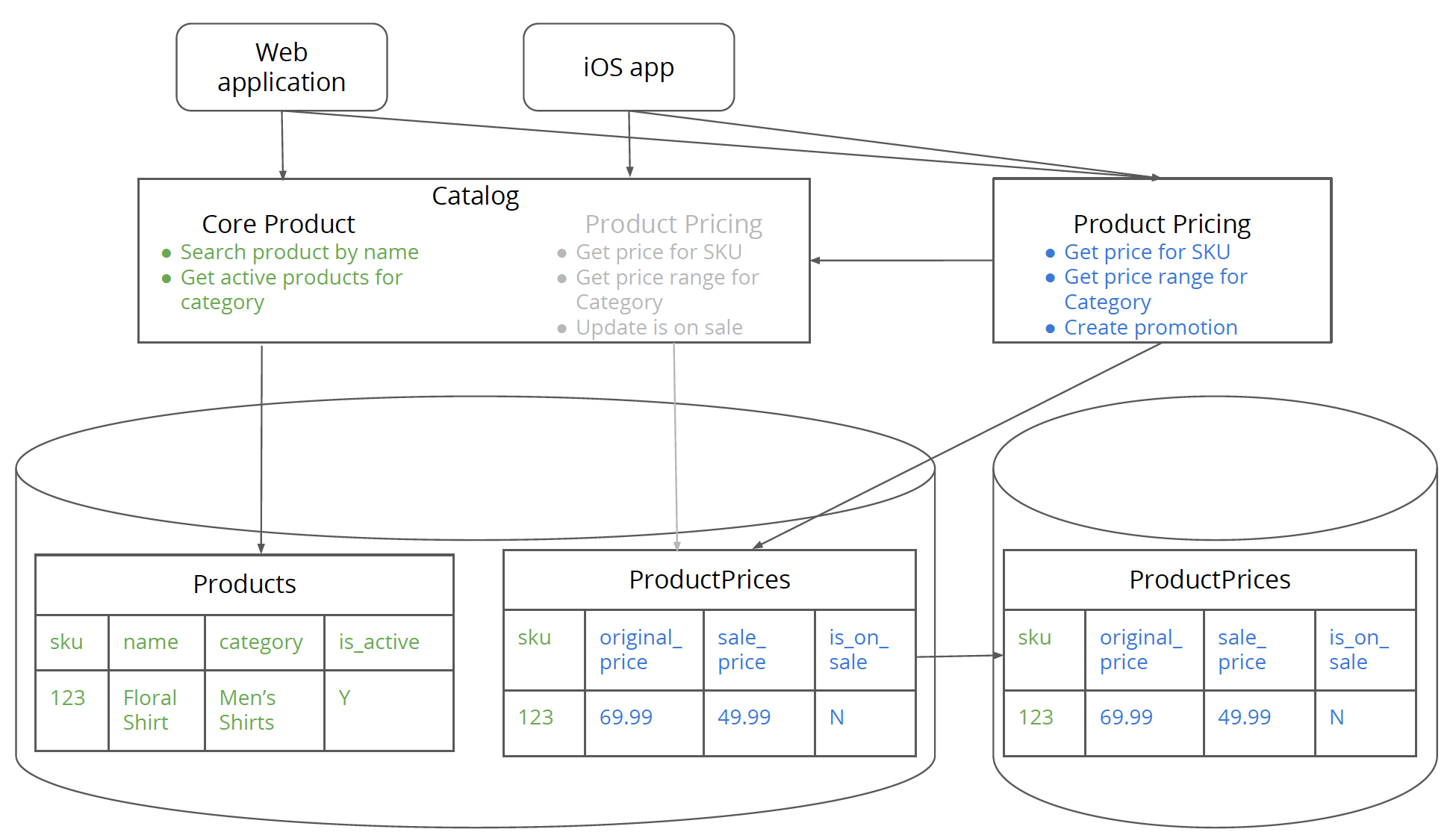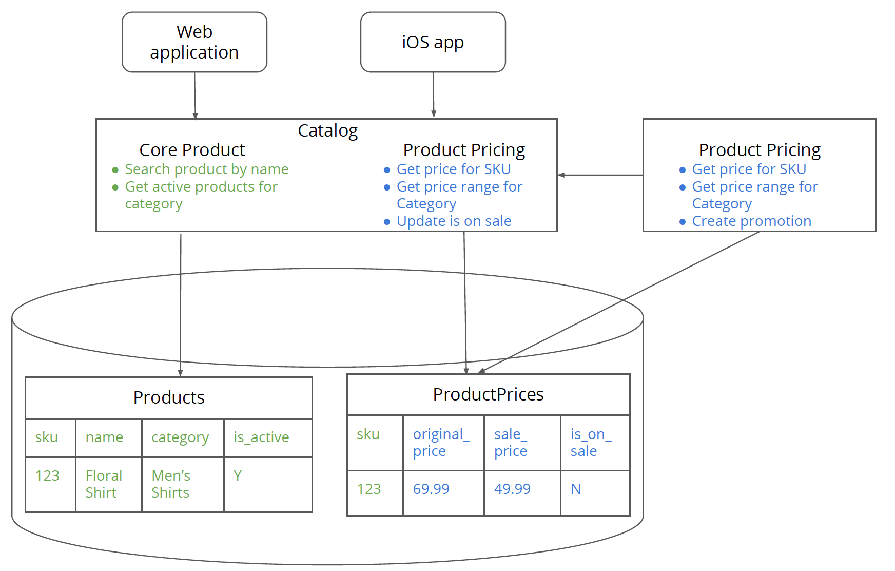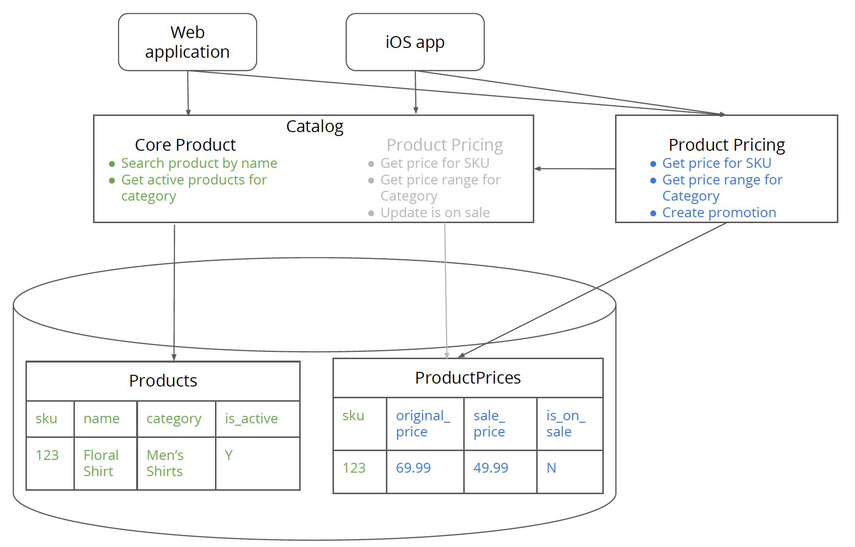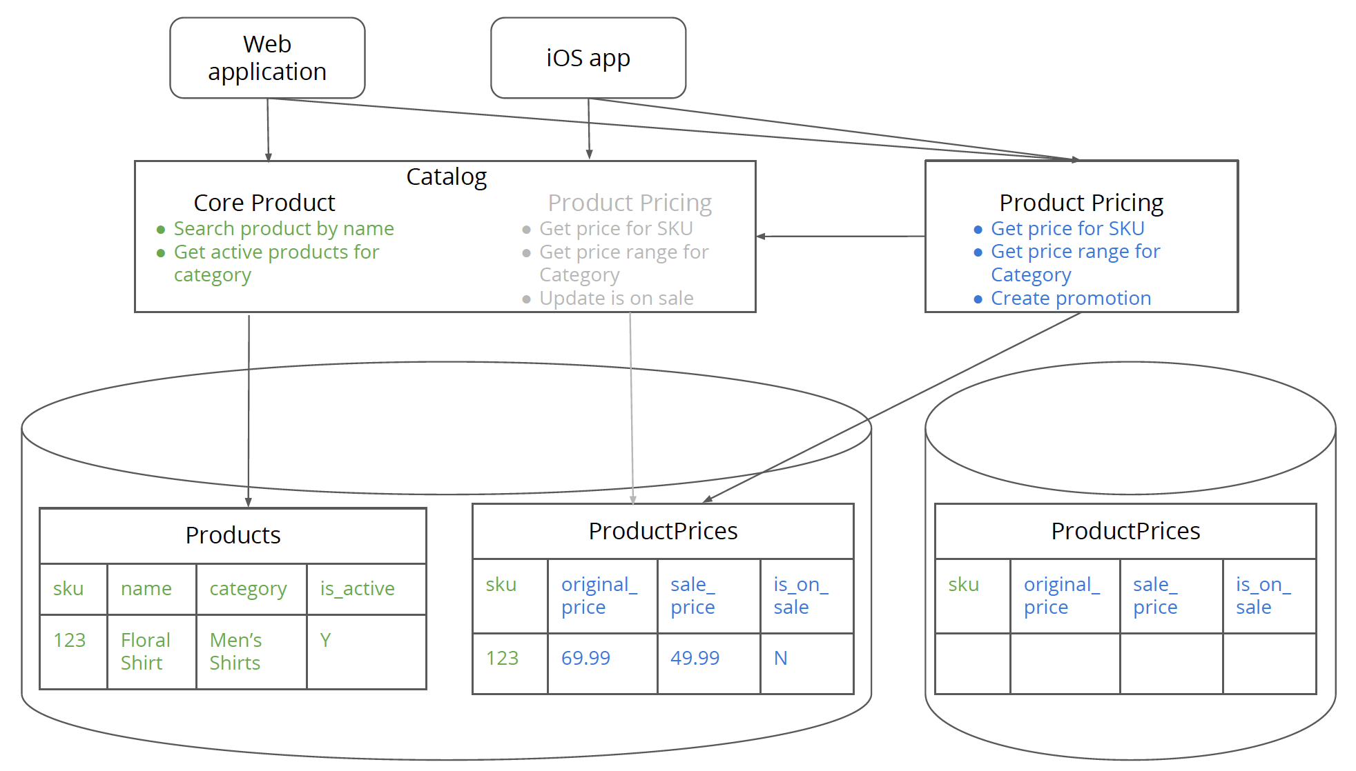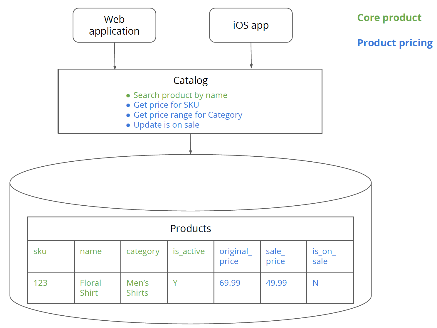 Figure 1: Catalog monolith consists of the application logic and database for core product as well as product pricing. The Catalog monolith has two clients – the web application and iOS app.
