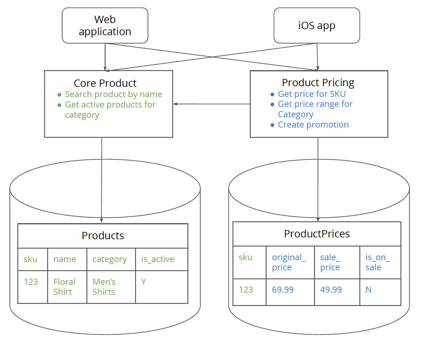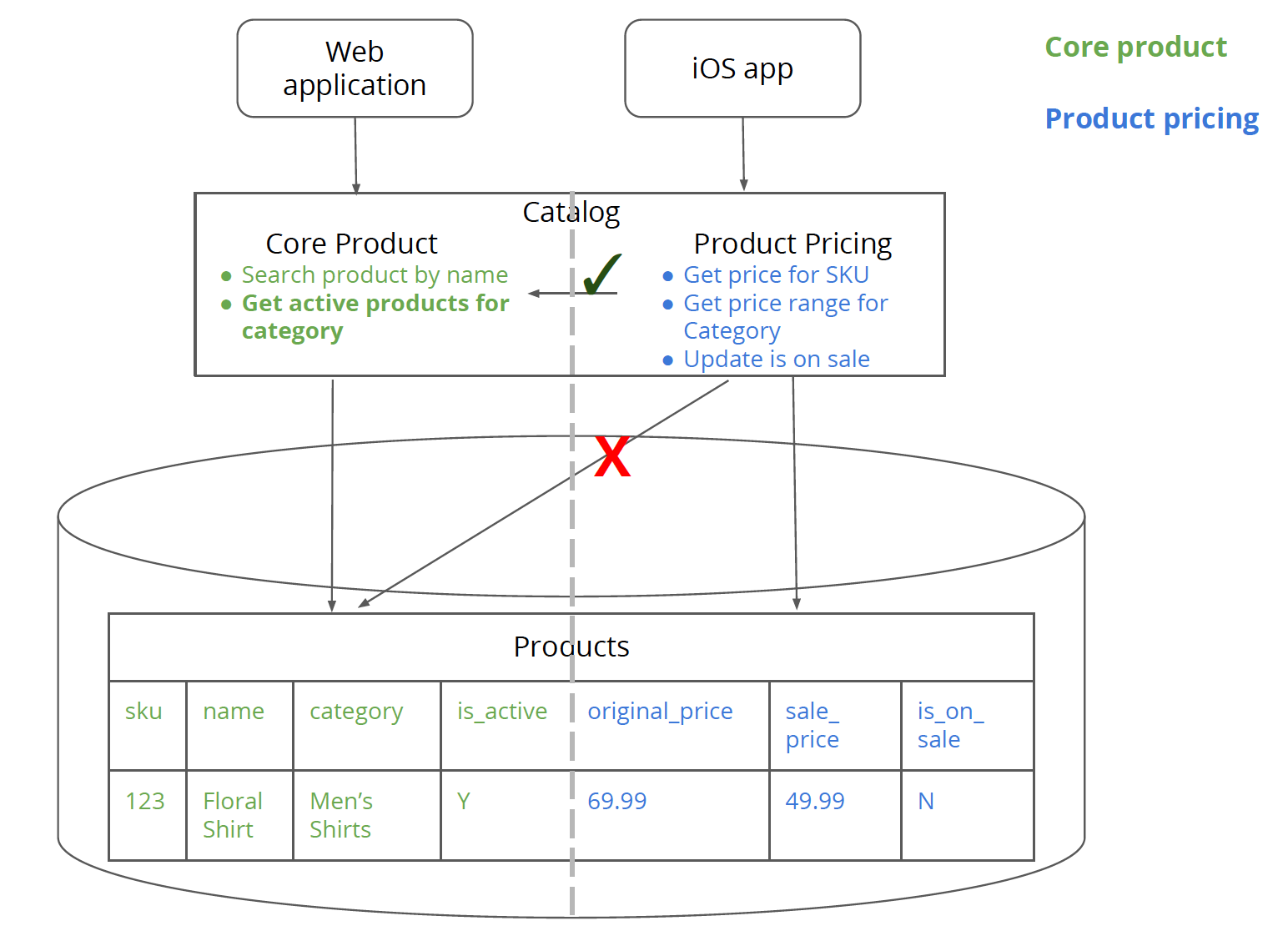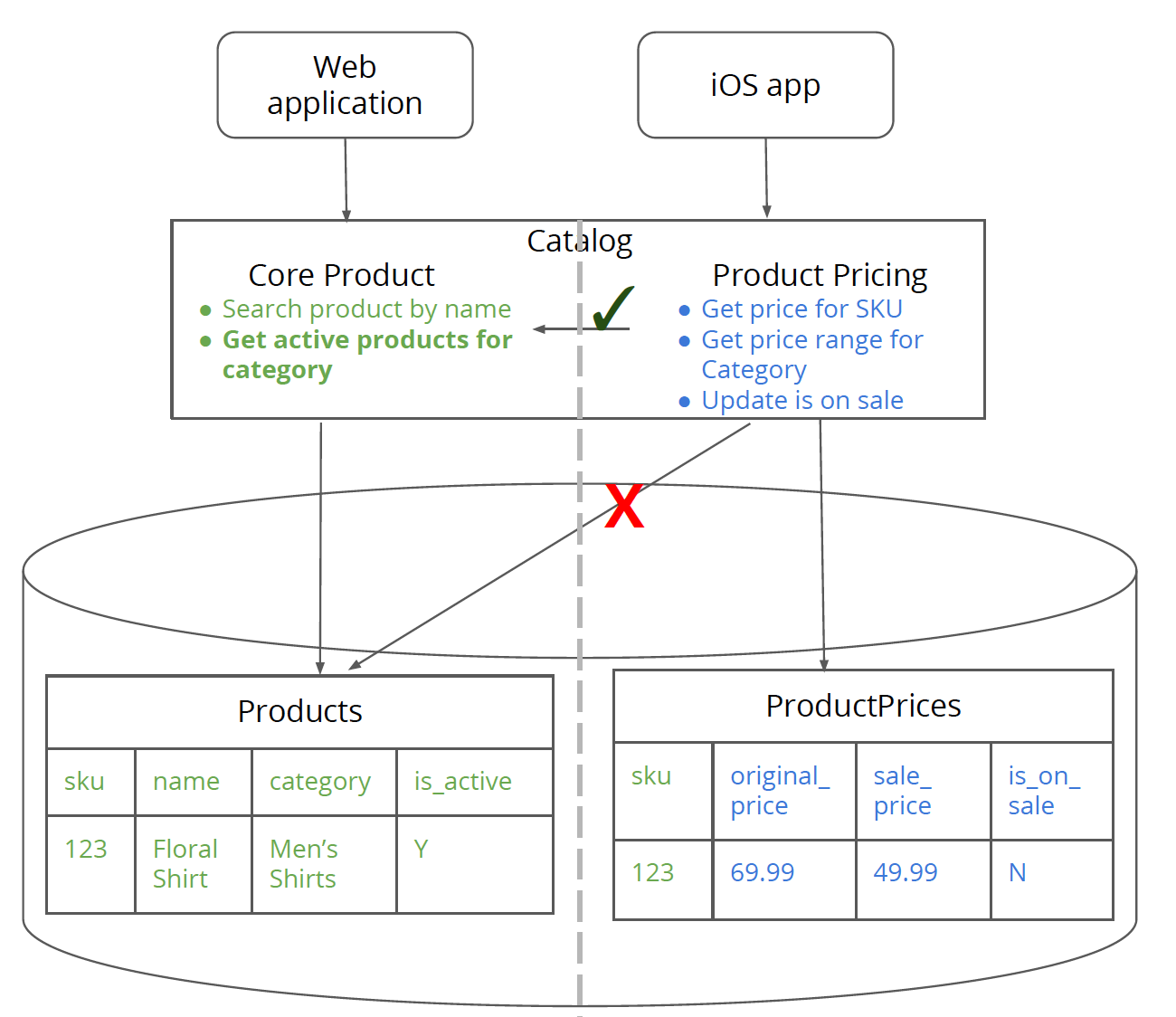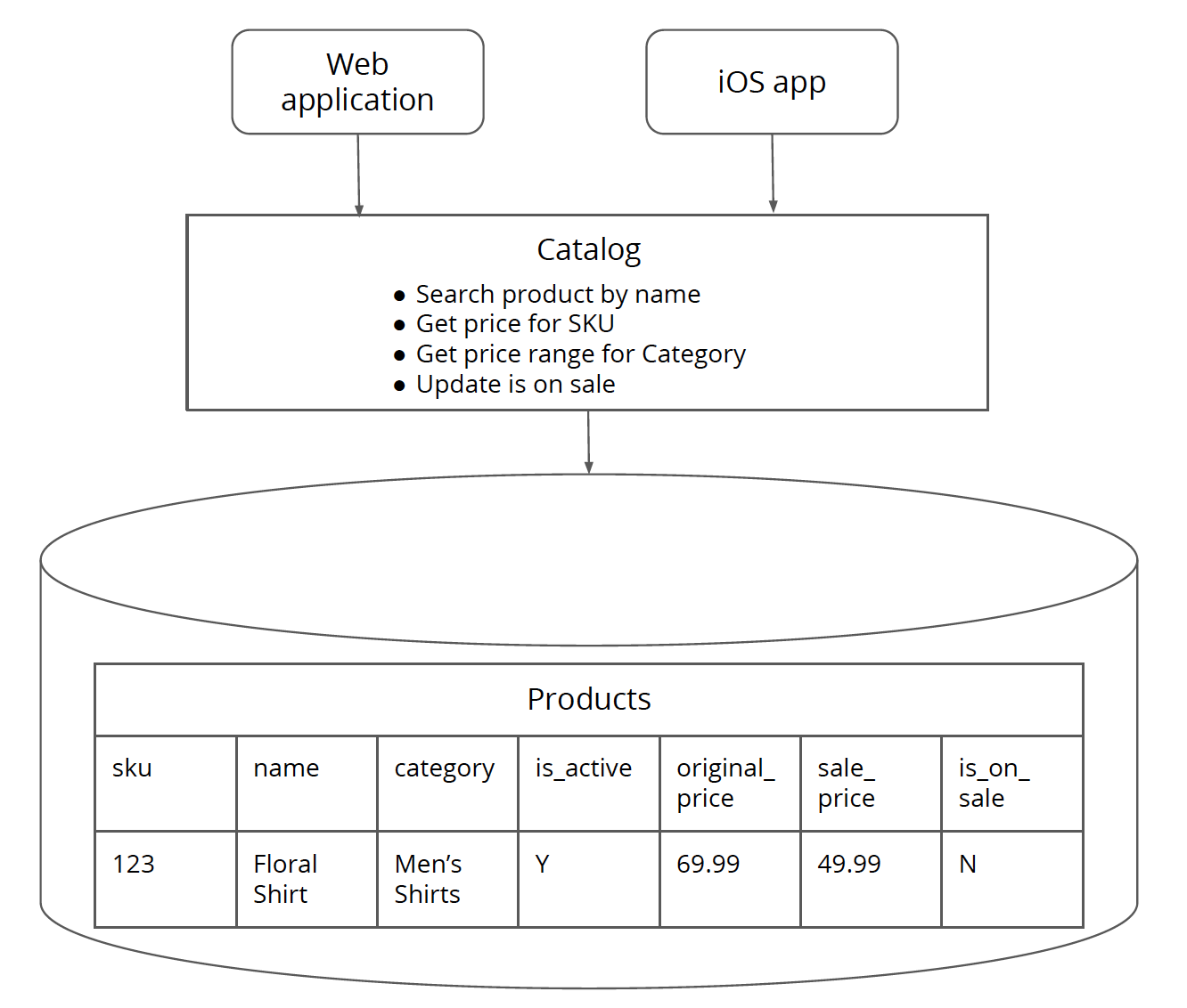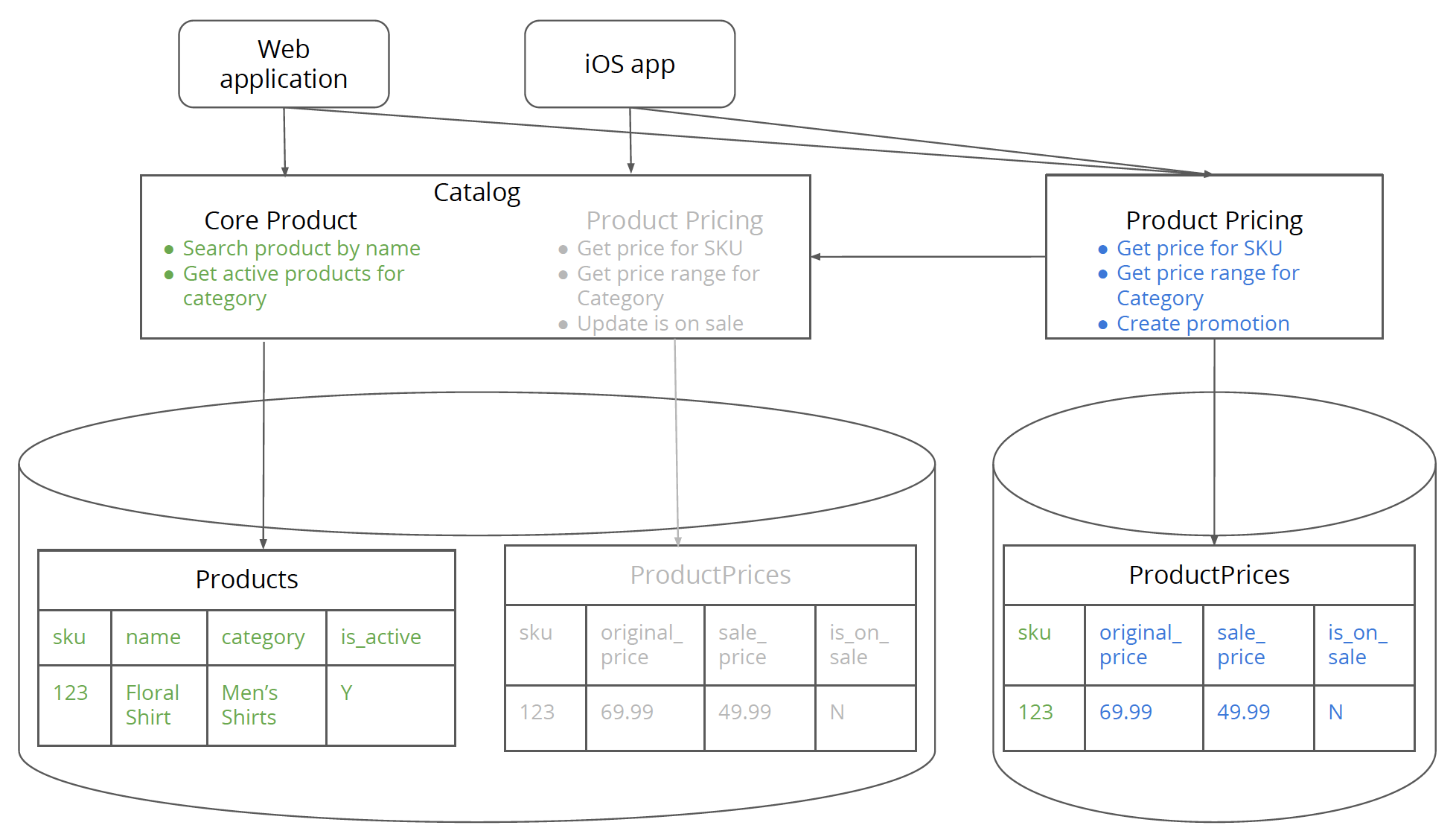Figure 1: Catalog monolith consists of the application logic and database for core product as well as product pricing. The Catalog monolith has two clients – the web application and iOS app.