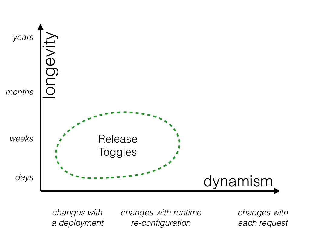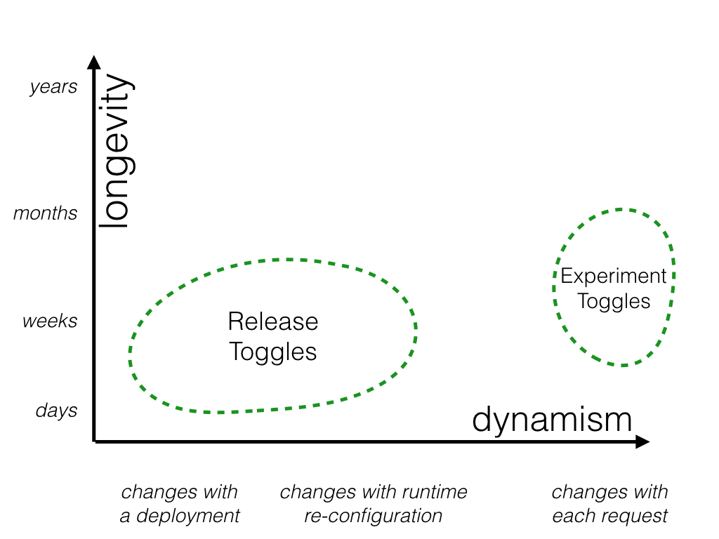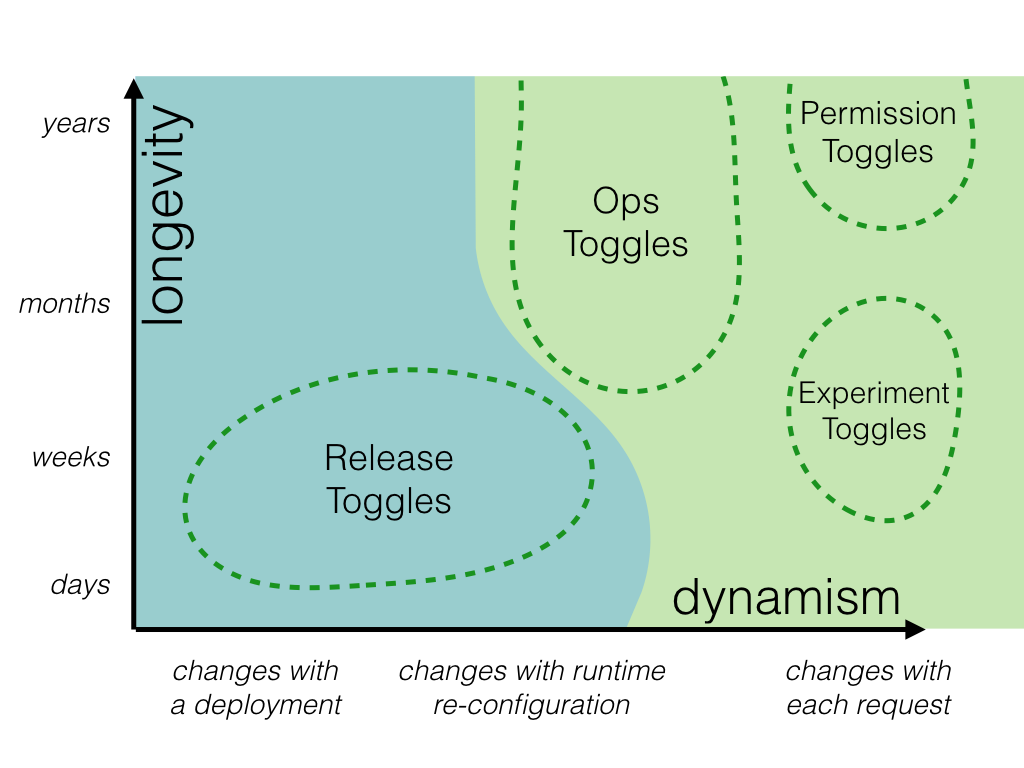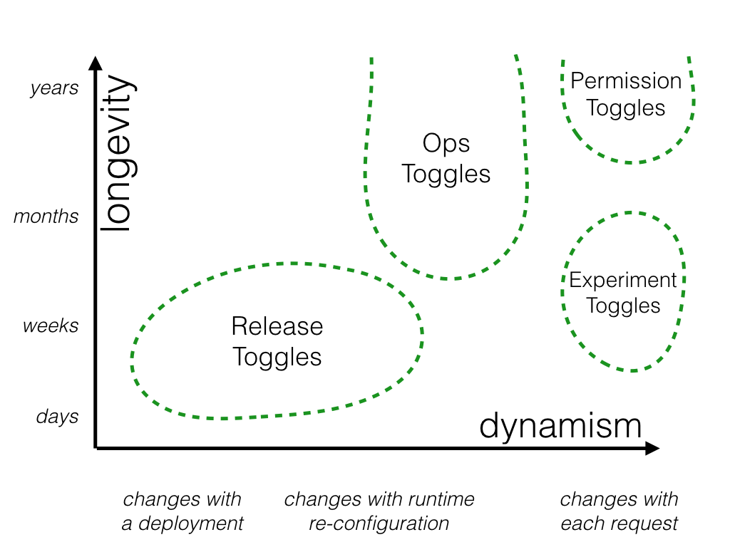 Feature toggles can be categorized across two major dimensions: how long the feature toggle will live and how dynamic the toggling decision must be. There are other factors to consider - who will manage the feature toggle, for example - but I consider longevity and dynamism to be two big factors which can help guide how to manage toggles.