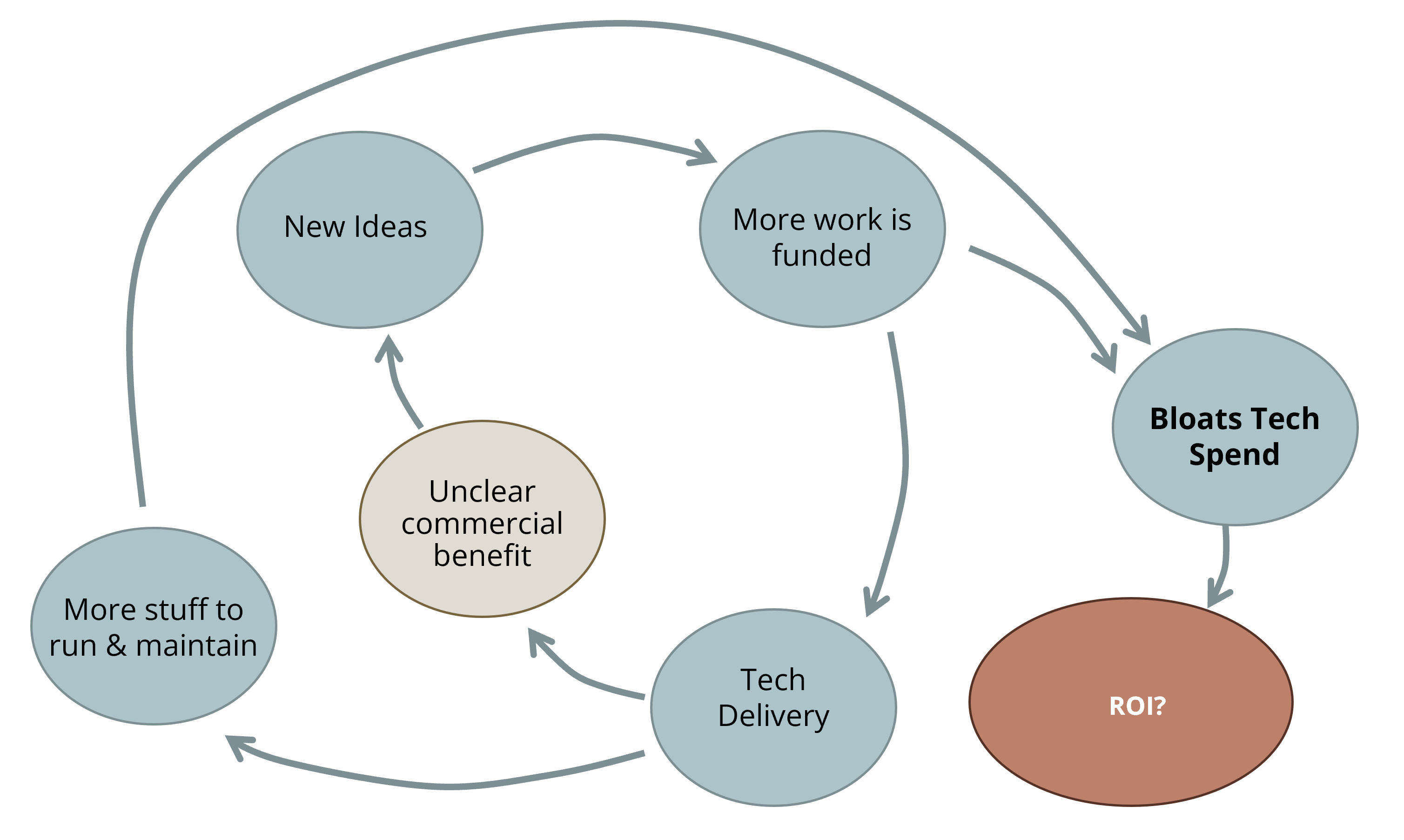 As part of supporting the business, you continue to deliver new digital products and capabilities. However, the commercial (business) impact of all this delivery is often unclear. This is because impact-feedback loops are absent. Faced with unclear impact, more ideas are executed to move the needle somehow. Spray and pray! A feature factory takes shape. The tech estate balloons.