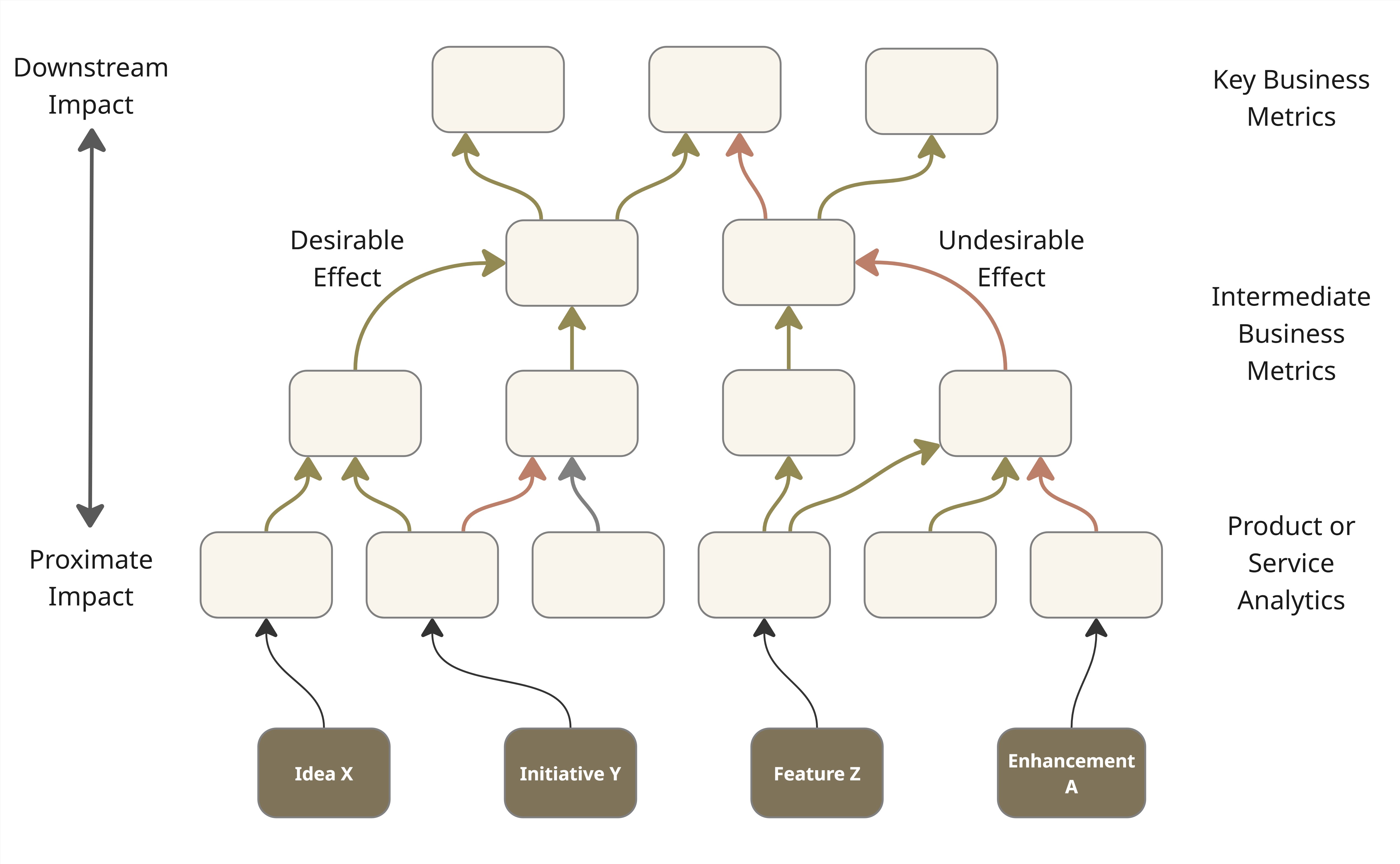 The bottom row of features, initiatives etc. is a temporary overlay on the impact network which, as noted earlier, is basically a KPI tree1 where every node is a metric or something that can be quantified. I say temporary because the book of work keeps changing while the KPI tree above remains relatively stable.