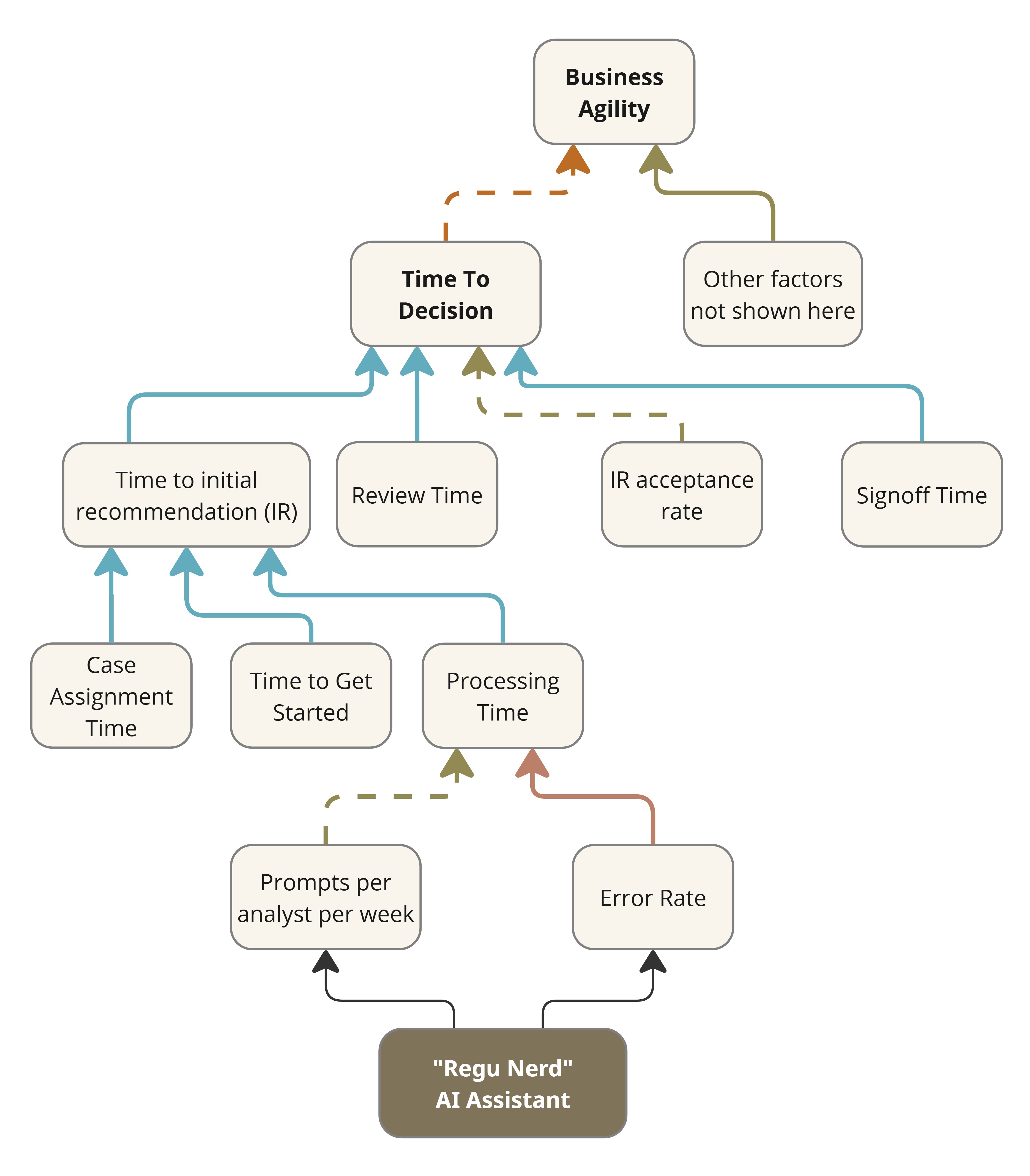 Consider a common workflow in regulatory compliance. A compliance analyst is assigned a case. They study the case, its relevant regulations and any recent changes to them. They then apply their expertise and arrive at a recommendation. A final decision is made after subjecting the recommendation to a number of reviews and approvals depending on the importance or severity of the case. The Time to Decision might be of the order of hours, days or even weeks depending on the case and its industry sector. Slow decisions could adversely affect the business. If it turns out that the analysts are the bottleneck, then perhaps it might help to develop an AI assistant (“Regu Nerd”) to interpret and apply the ever-changing regulations. Figure 4 shows the impact network for the initiative.