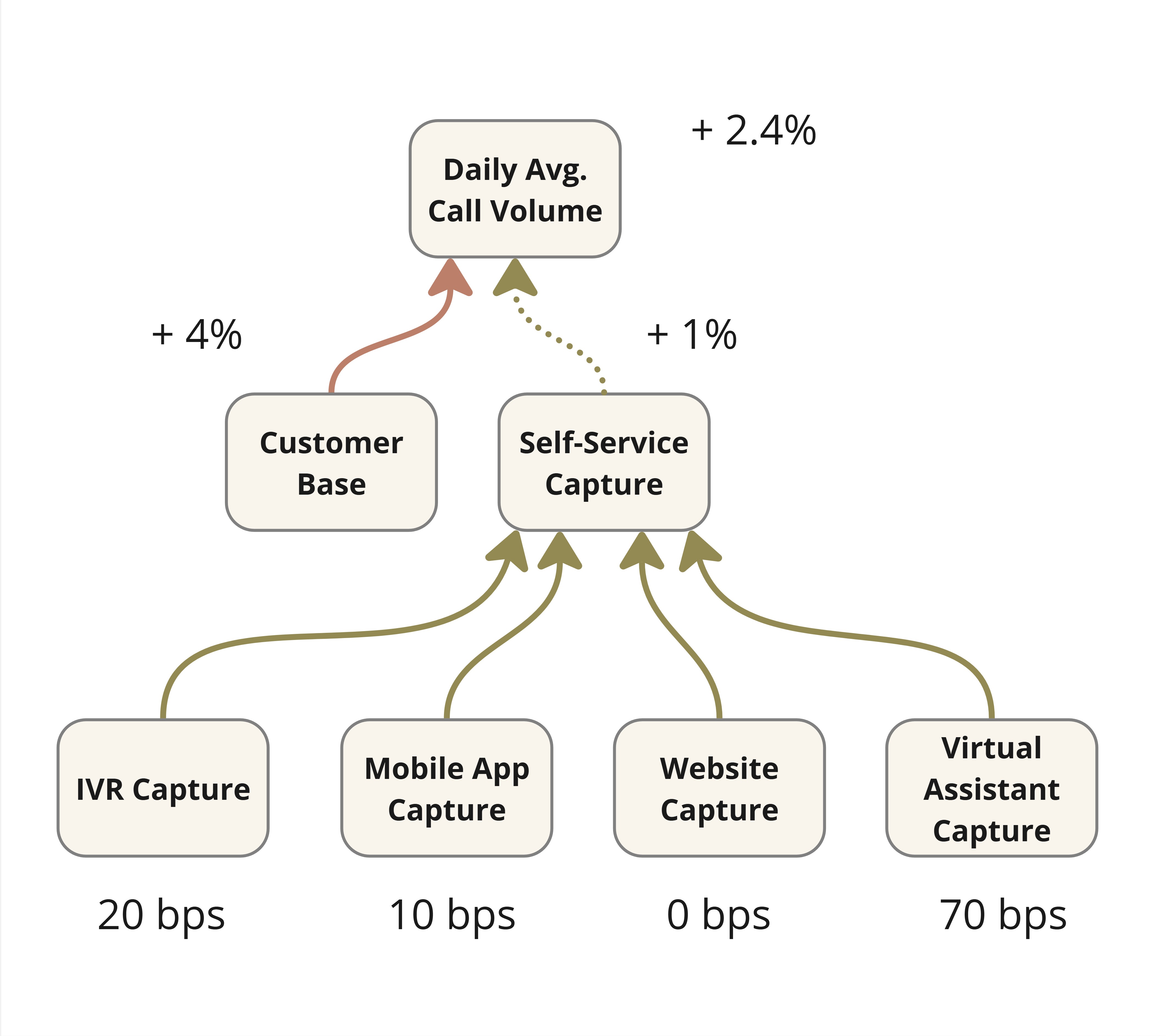 It shows that call volumes only rose by 2.4% quarter-on-quarter despite a 4% growth in the customer base. The model assumes that if nothing else changes, the change in call volume should match the change in the customer base. We see a difference of 1.6 percentage points or 160 basis points. How do we explain this? Your data analysts might inform you that 60 bps is explained by seasonality. We credit the rest (100 bps) to self-service channels and ask them to claim their contributions. After a round of contribution analysis, you might arrive at the numbers at the bottom. You could use some heuristics and simple data analysis to arrive at this. I call it Simple Impact Attribution to contrast it with more rigorous methods (e.g., controlled experiments) that a data scientist might prefer but which might not always be feasible.