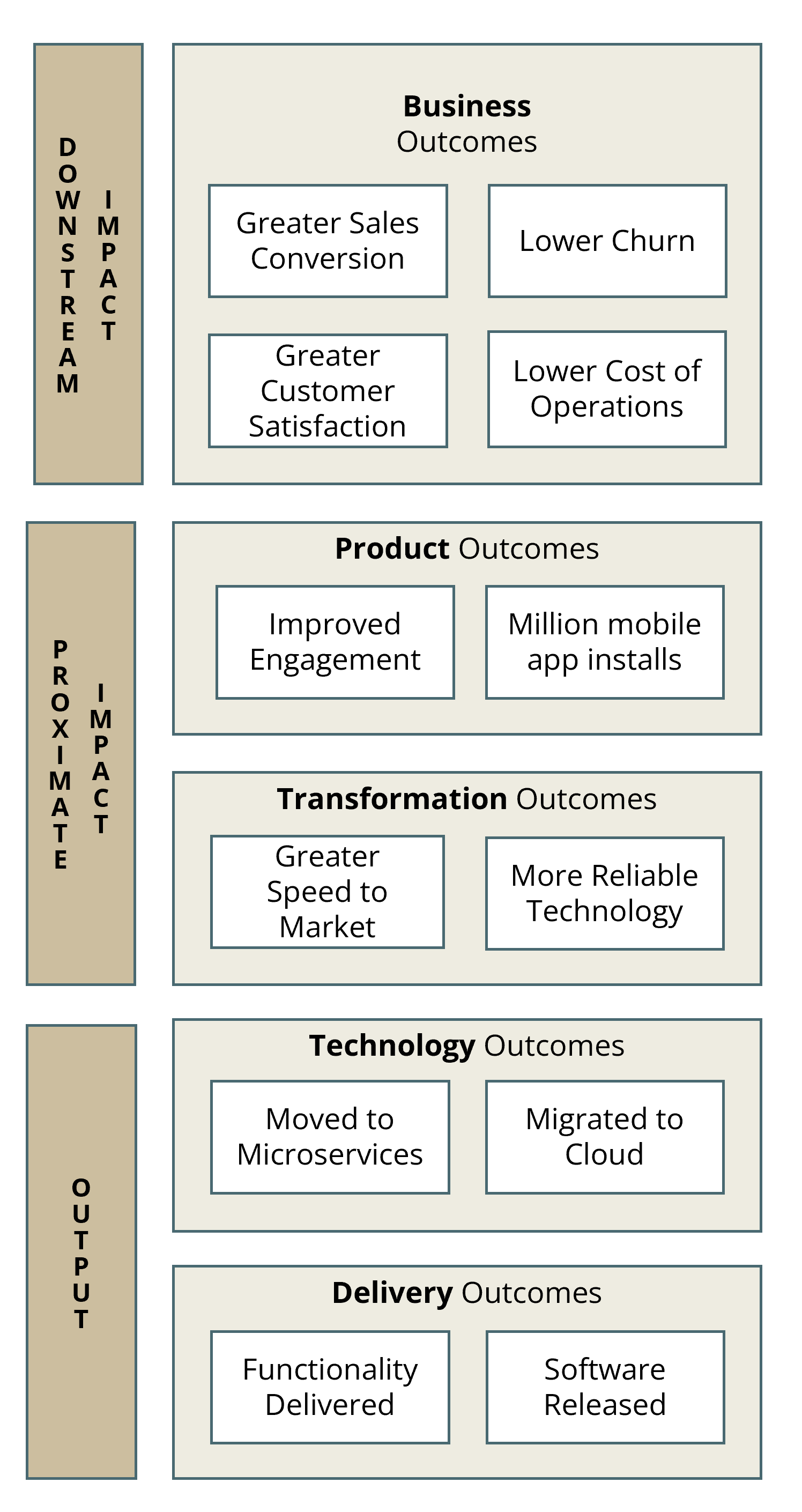 It can feel lonely if you are the only senior exec advocating for greater impact intelligence. But you don’t have to run a lonely campaign. Help your delivery teams understand the big picture and rally them around to your cause. Help them appreciate that software delivery does not automatically imply business impact. Even feature adoption does not. Start by helping them understand the meaning of business impact in different contexts. I have found it useful to explain this with an illustration of a hierarchy of outcomes as in Figure 8 The ones at the top are closest to business impact. The lower-level outcomes might support or enable the higher-level outcomes, but we should not take that for granted. Impact intelligence is about tracking that the supposed linkages work as expected. When your teams internalize this hierarchy, they’ll be able to help you implement robust demand management even more. They’ll begin to appreciate your nudges to reduce measurement debt. They’ll start asking Product and business leaders about the business impact of functionality that was delivered.