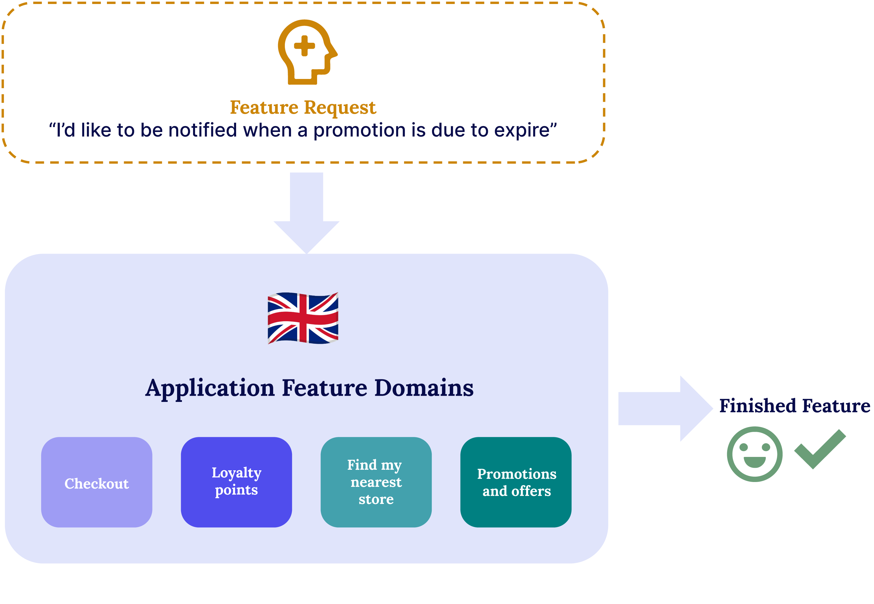 The feature request is passed to the app squads that own the relevant domain. Our strict bounded context means that the blast radius of our change is contained within itself, meaning our feature can be built, tested and even deployed without having to change another part of our application. We speed up our time to market and allow multiple features to be developed simultaneously in isolation. Great!