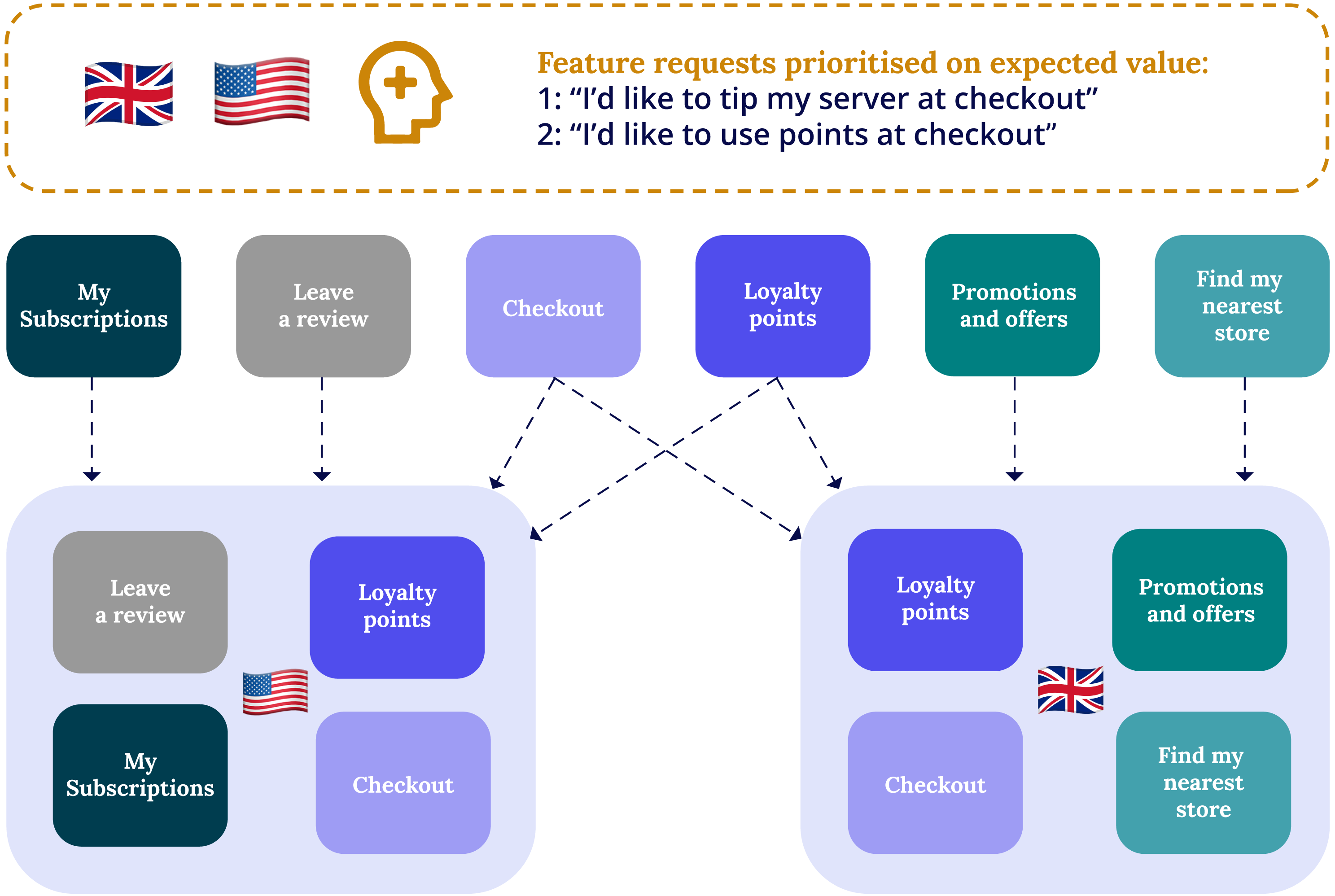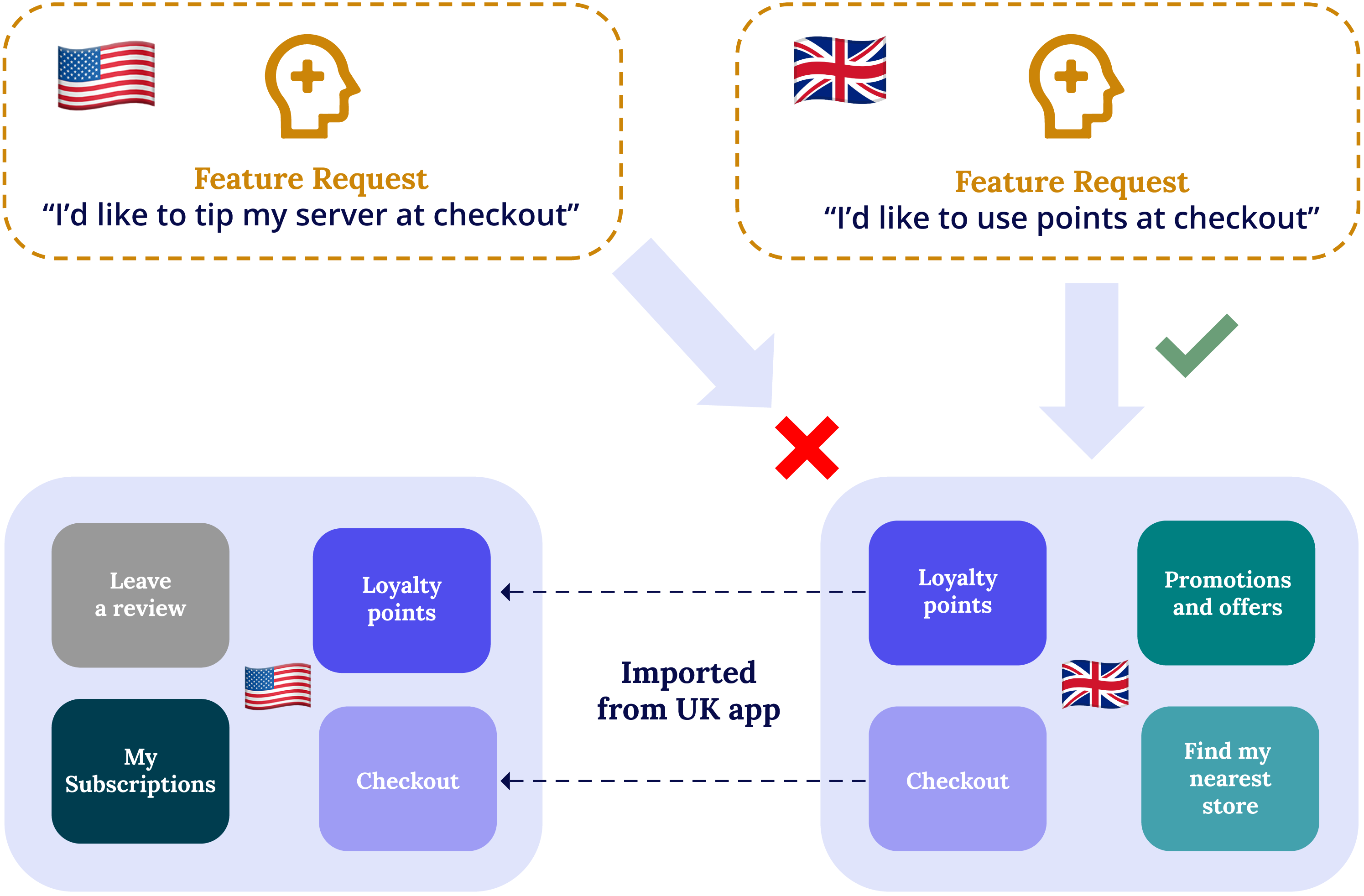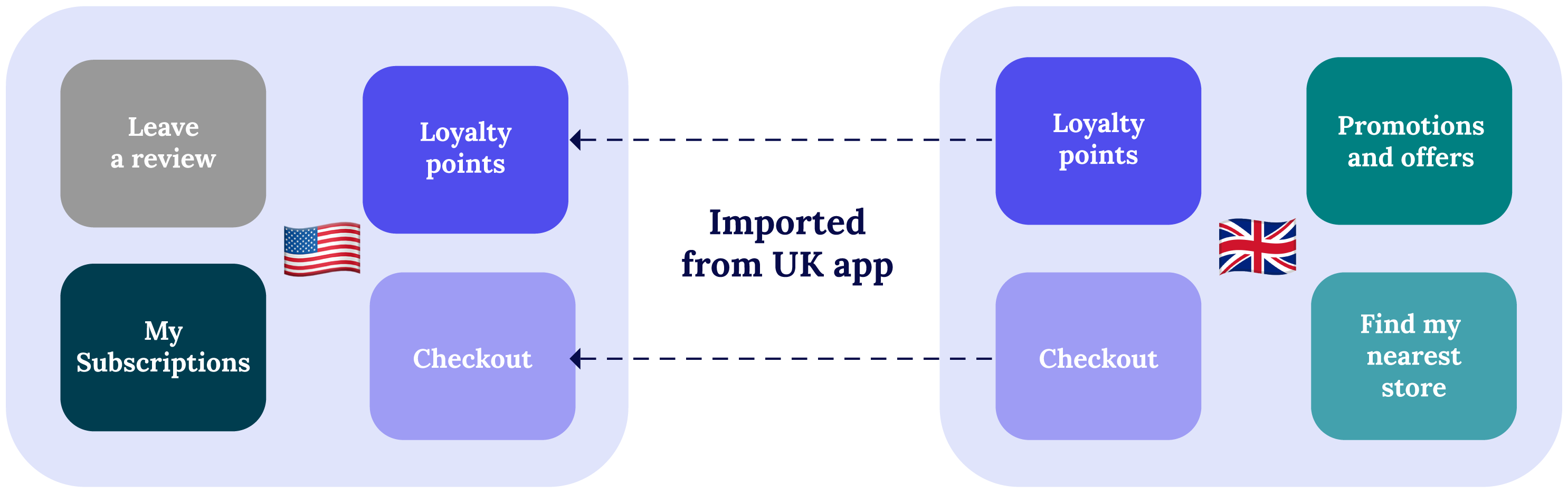 The next step for the organization on its quest for modularity of domains was to achieve rapid development savings by transplanting parts of the ‘tidy monolith’ into an existing market application. This involved the creation of a common framework (aspects of which we touch on later) that allowed functionalities/domains to be reused in a mobile application outside its origin. To better illustrate our methodology, the example below shows two market applications, one in the UK, the other, a new app based out of the US. Our US based application team has decided that in addition to their US specific domains they would like to make use of both the Loyalty Points and Checkout domains as part of their application and have imported them.