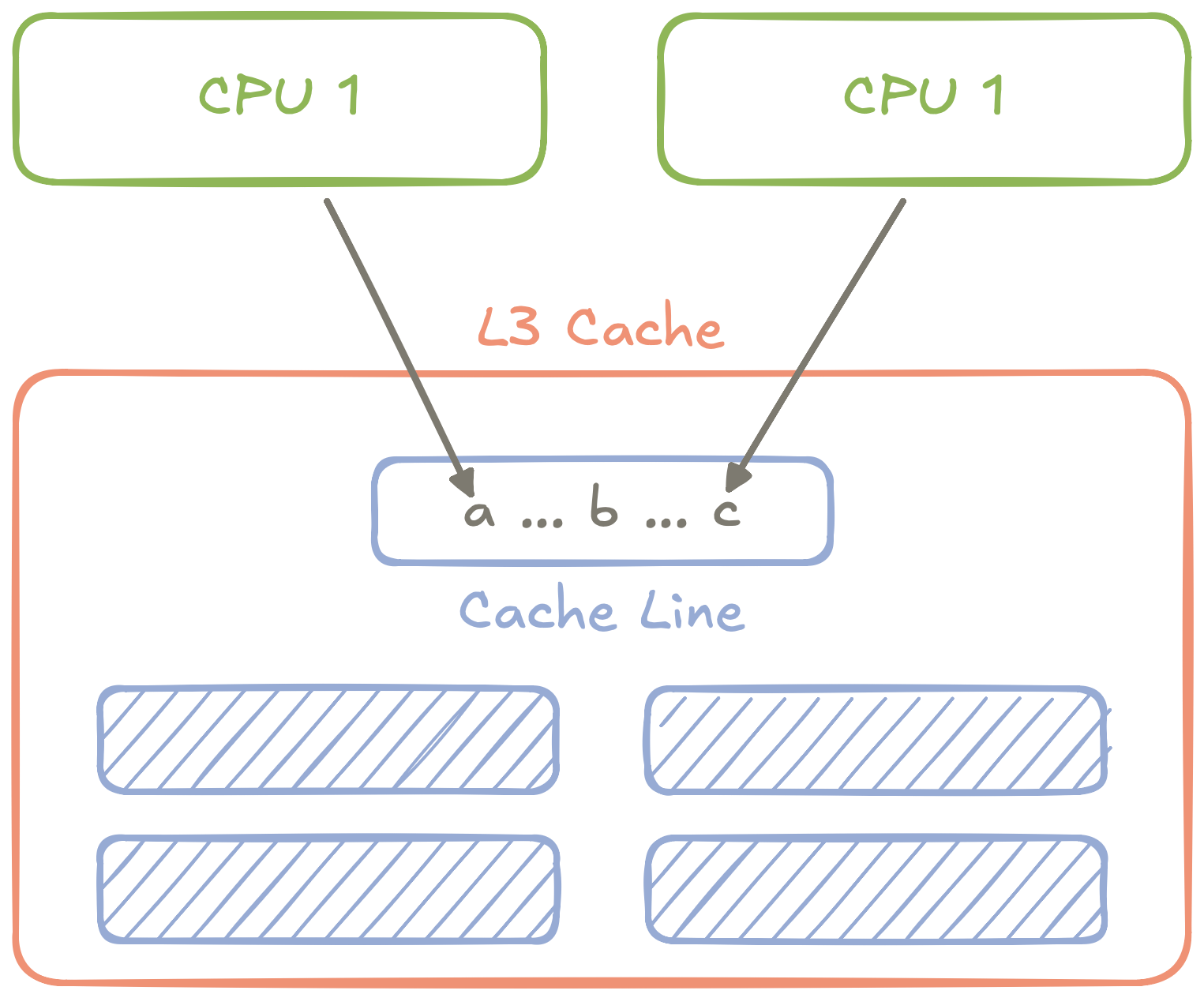 Figure 2: An abstract diagram of how two CPUs accessing two different variables can still conflict if the variables are in the same cache line.