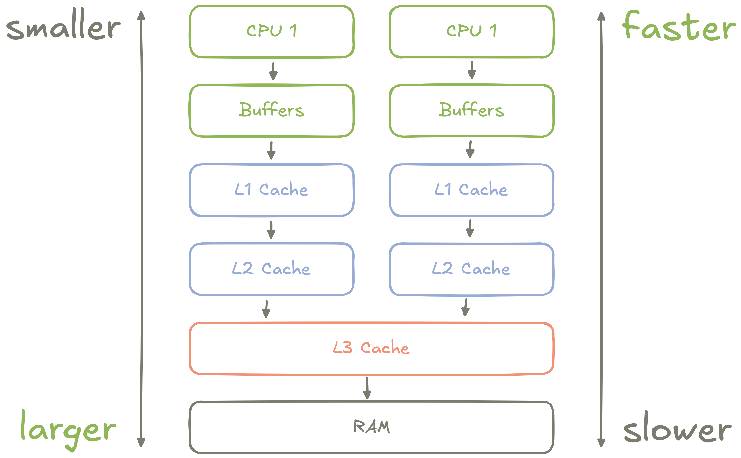 Most modern CPUs - from Intel's chips to Apple's silicon - organize memory into a hierarchy of registers, buffers, and caches, each with different access latencies: