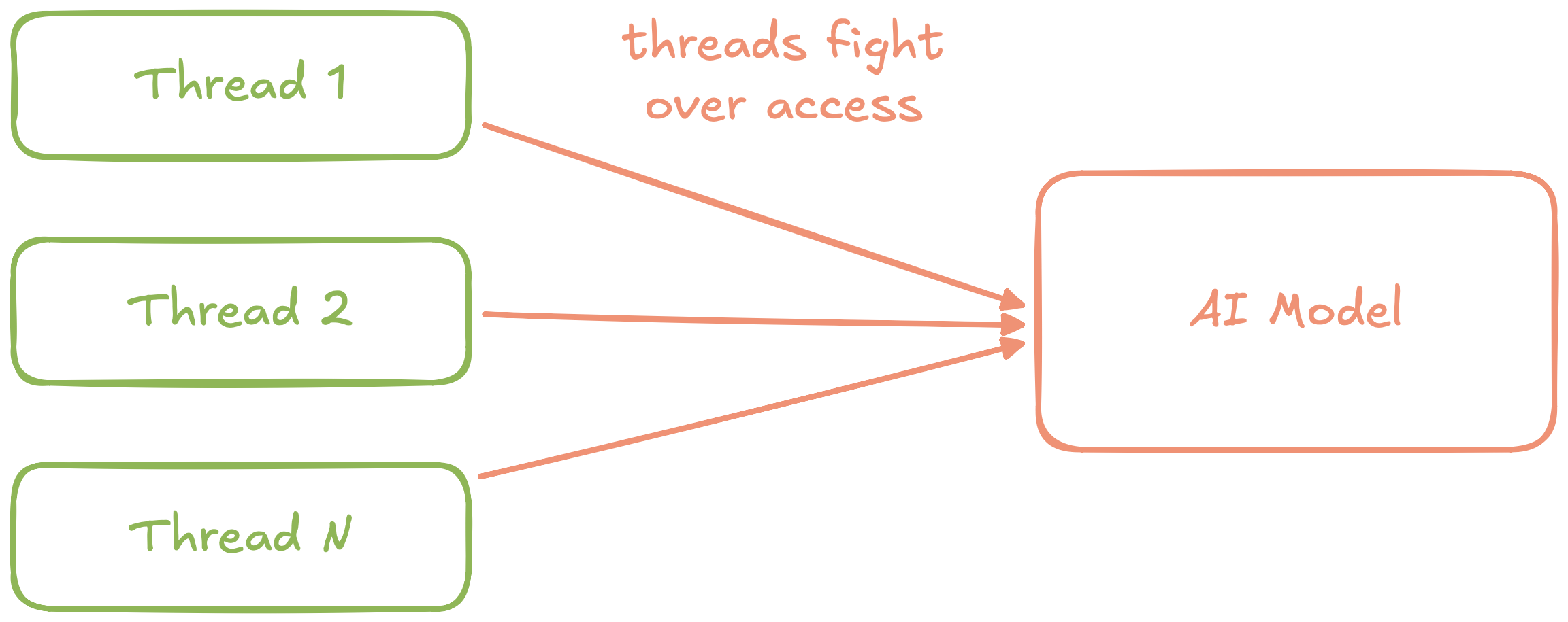 This service would quickly run into a problem: Most AI runtimes can only execute one inference call to a model at a time. In the naive architecture above, we use a mutex to work around this problem. Unfortunately, if multiple requests hit the service at the same time, they'll queue for the mutex and quickly succumb to head-of-line blocking.