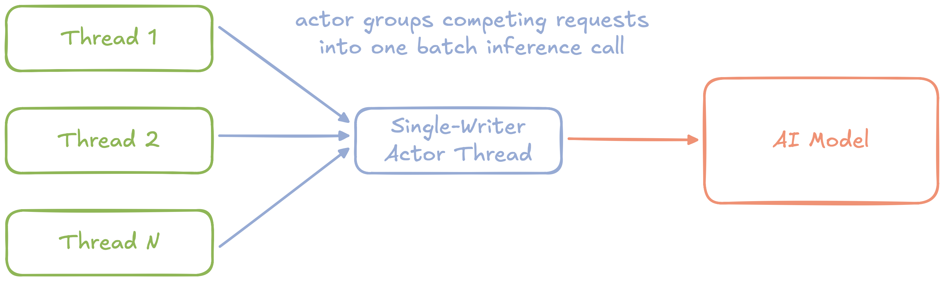Because the actor is the single-writer, it can group independent requests into a single batch inference call to the underlying model, and then asynchronously send the results back to individual request threads.