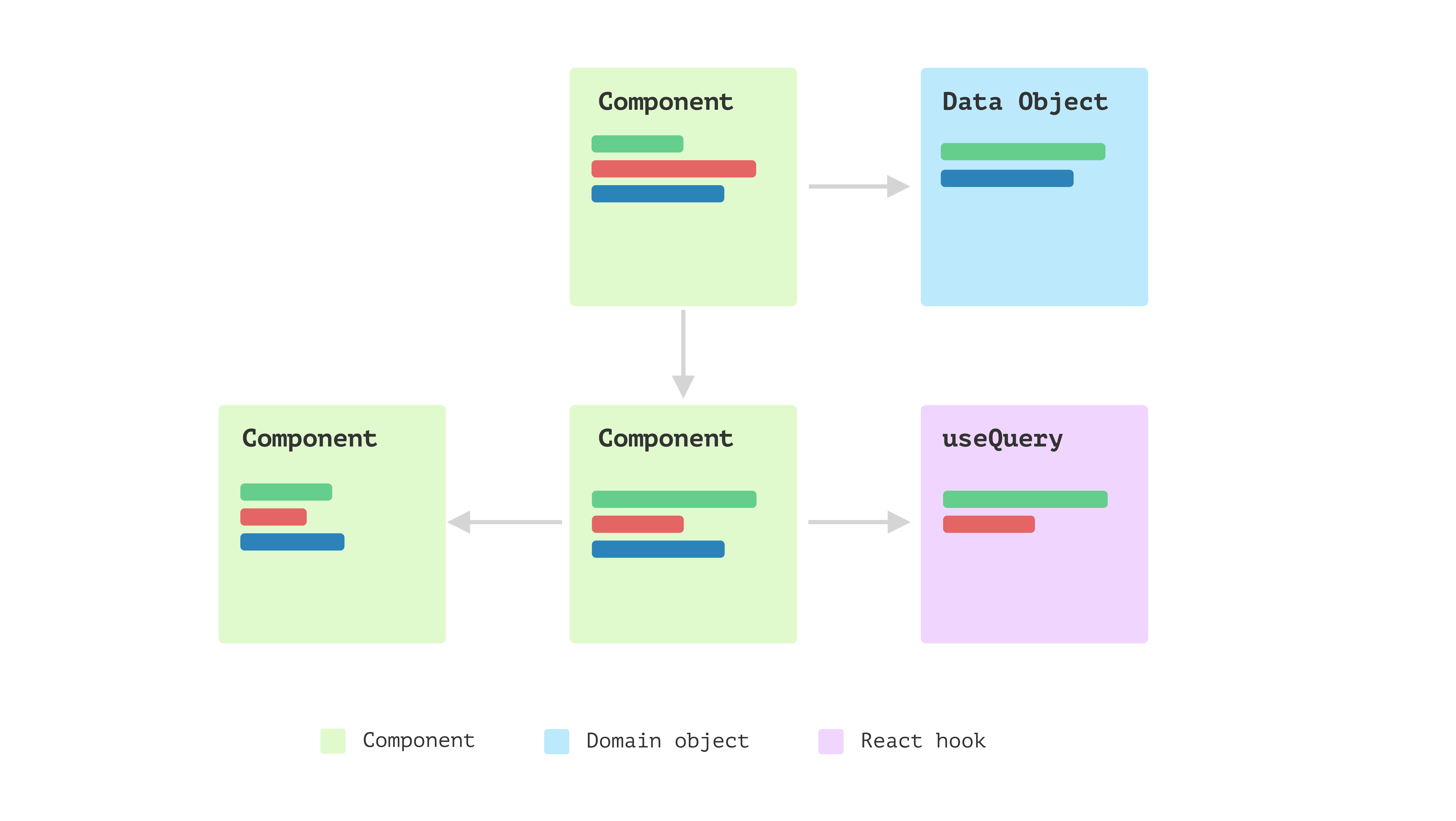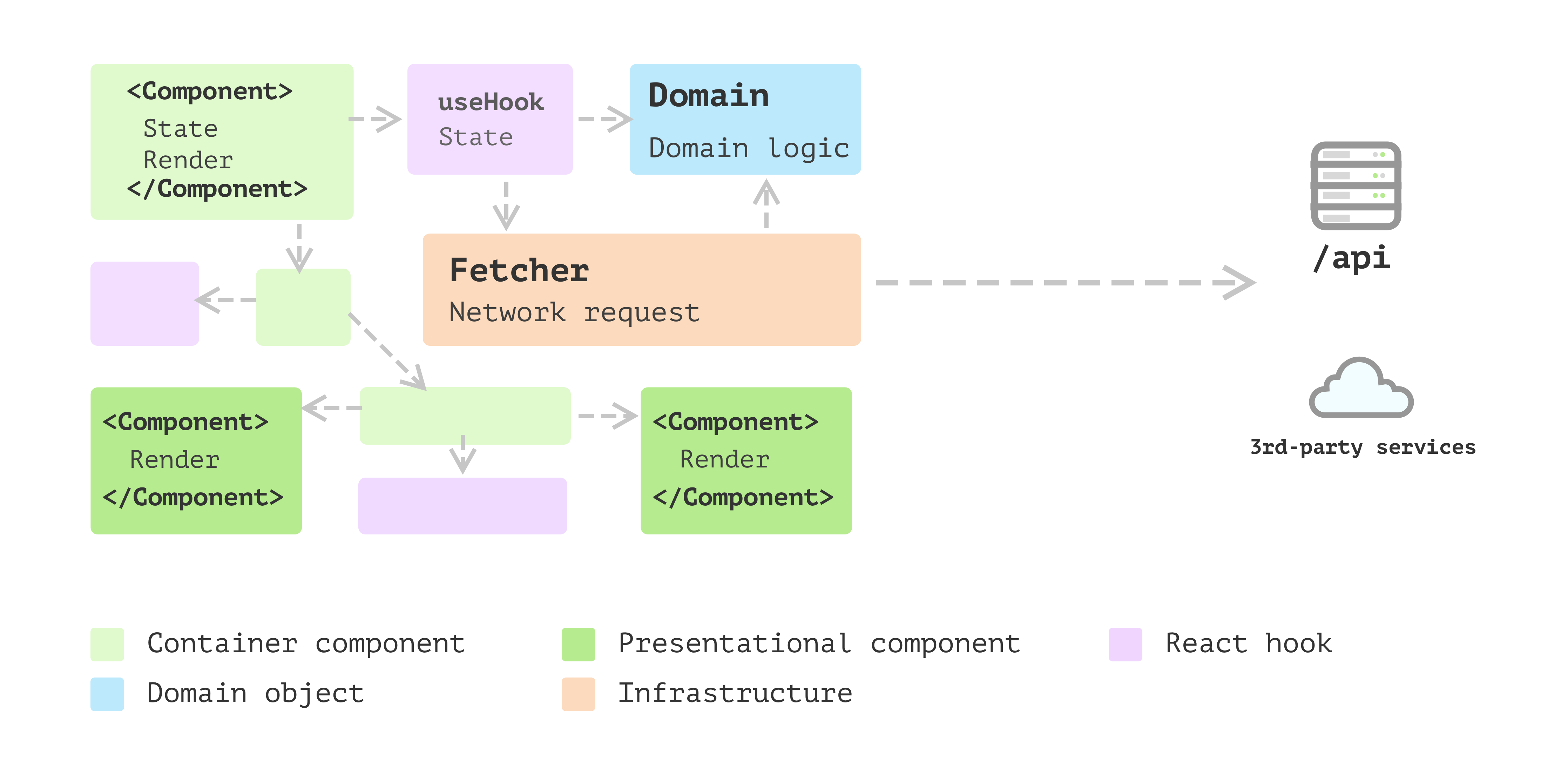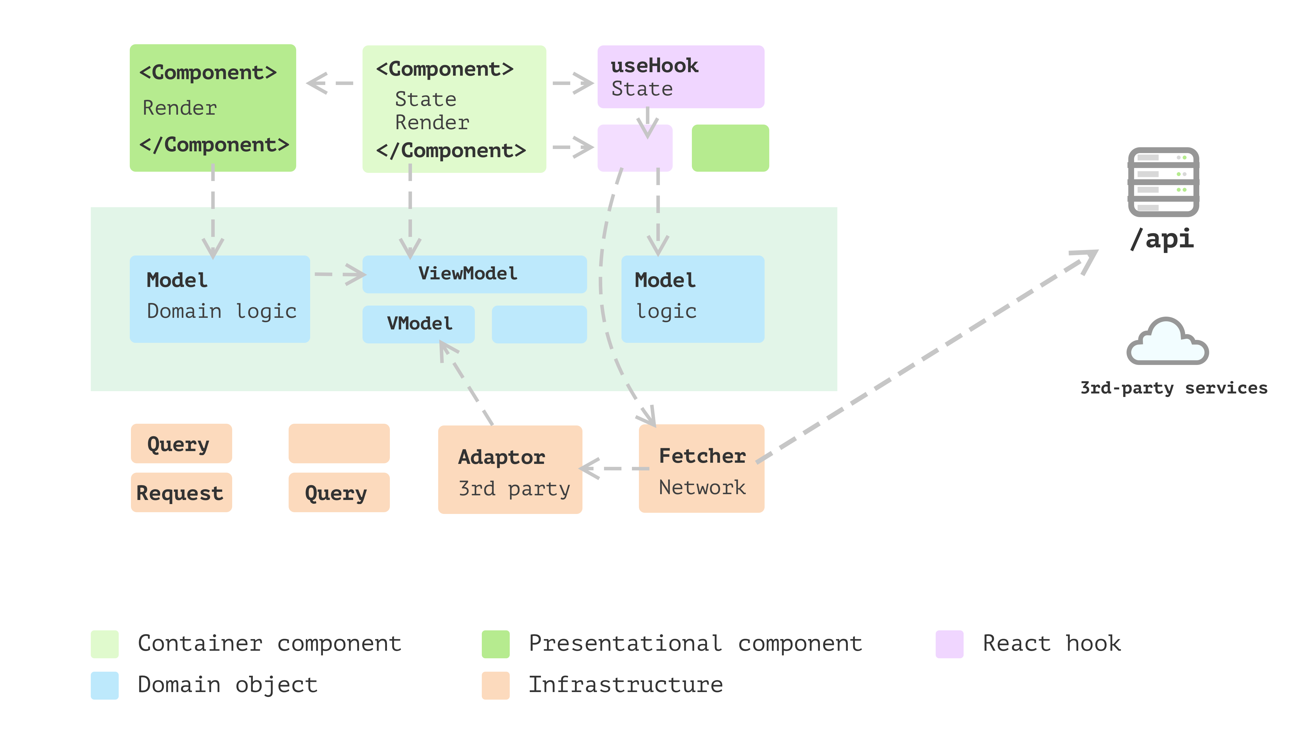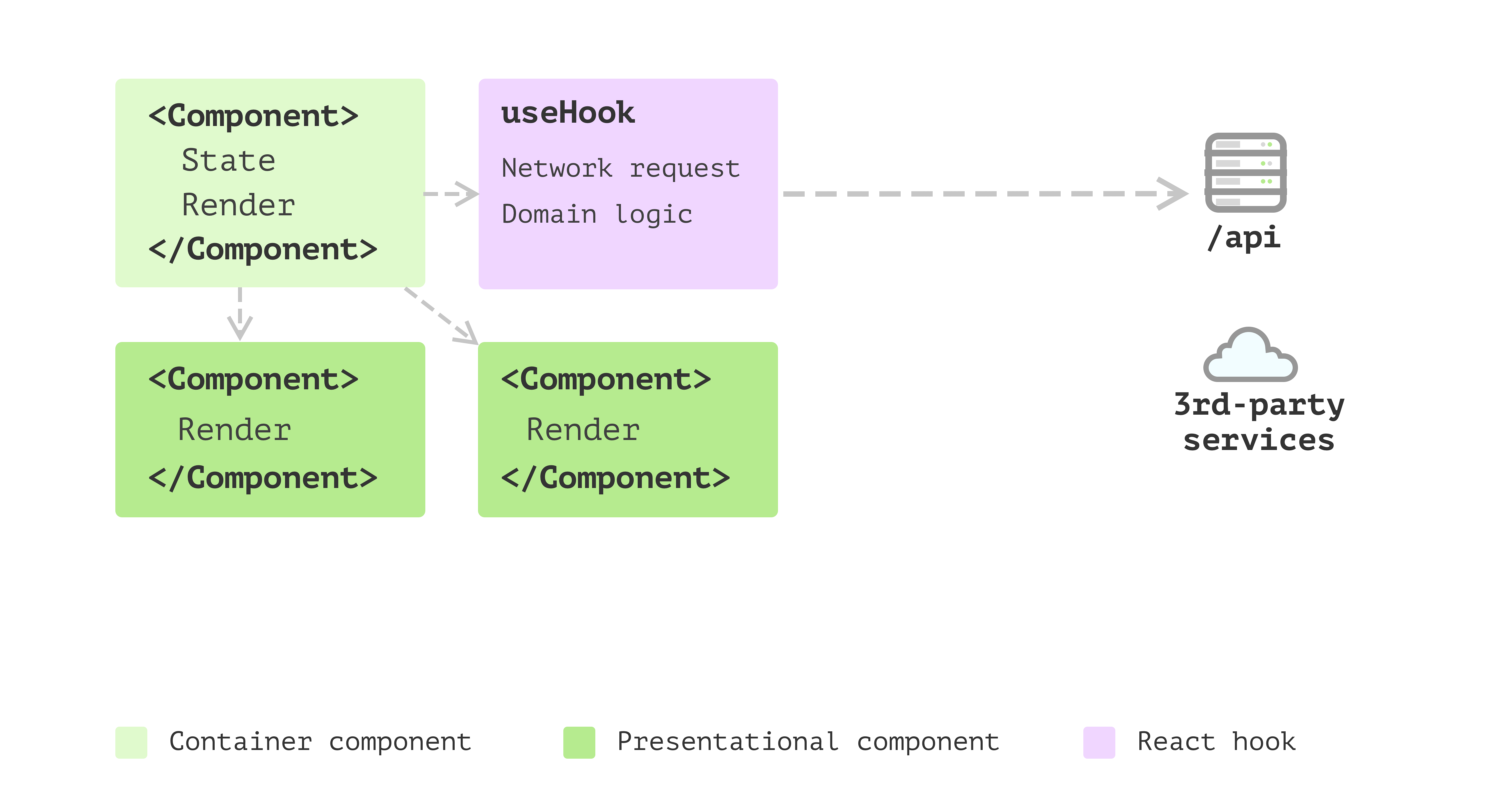 More often than not, people squeeze different things into React components or hooks to make the application work. This type of less-organised structure isn't a problem if the application is small or mostly without much business logic. However, as more business logic shifted to front-end in many cases, this everything-in-component shows problems. To be more specific, the effort of understanding such type of code is relatively high, as well as the increased risk to code modification.