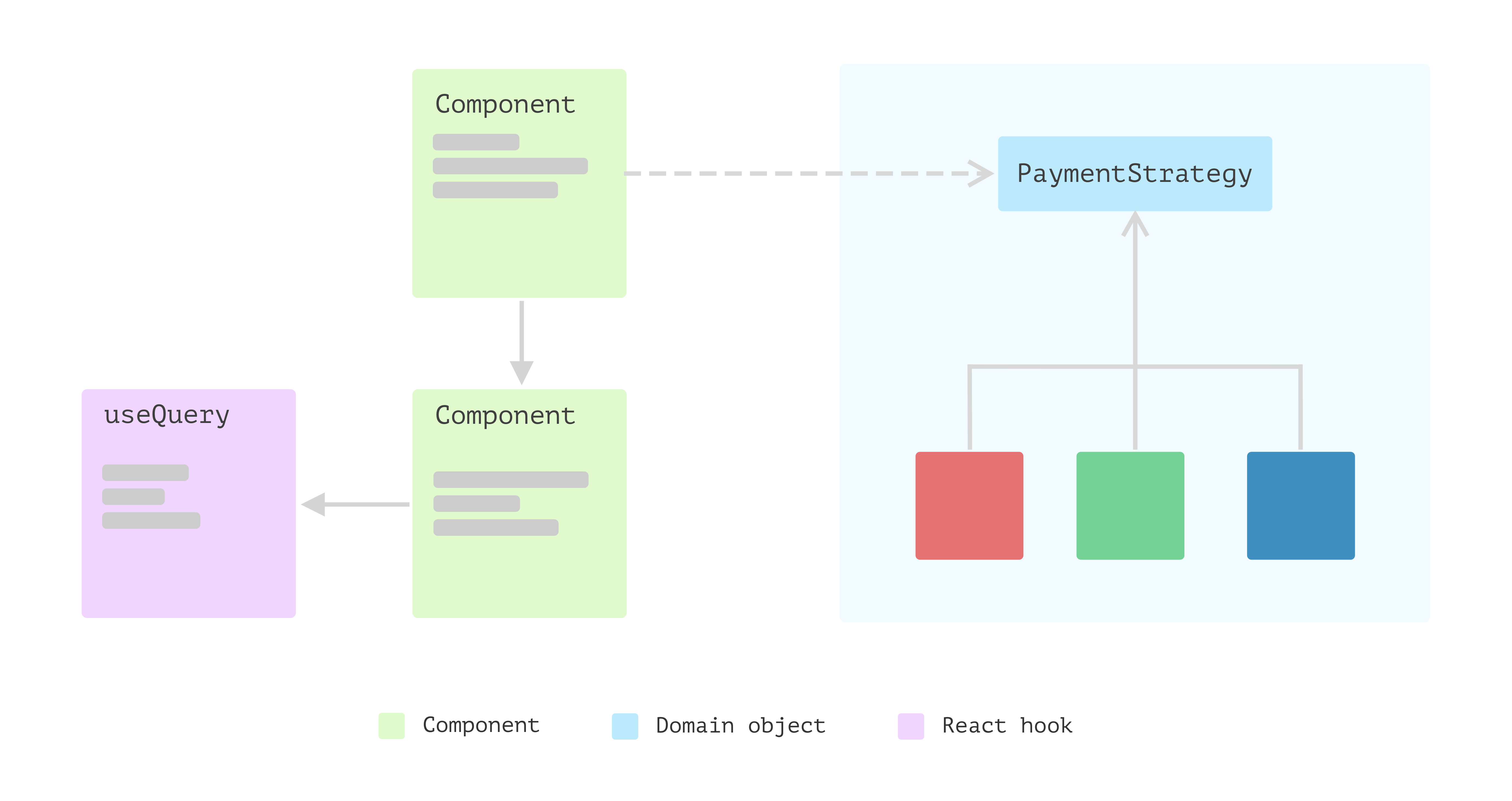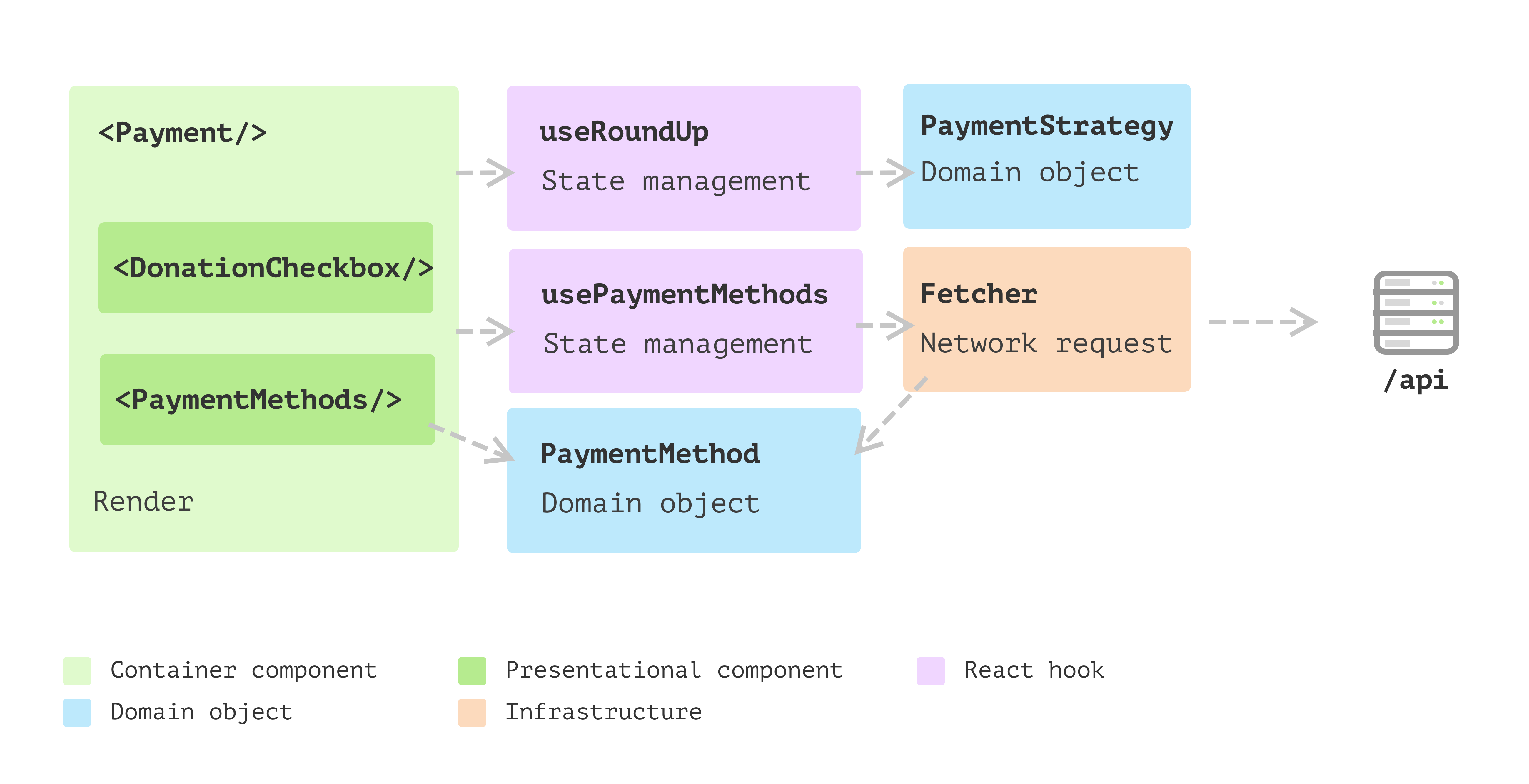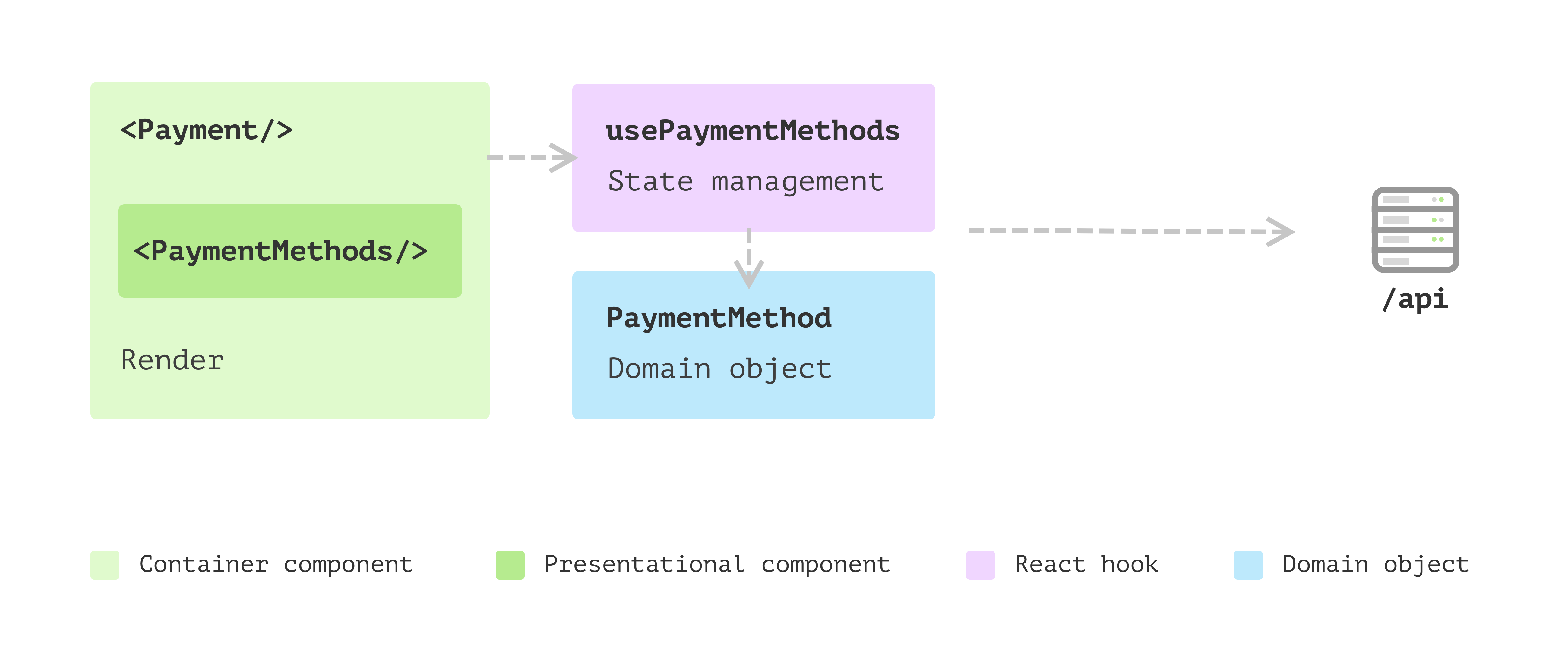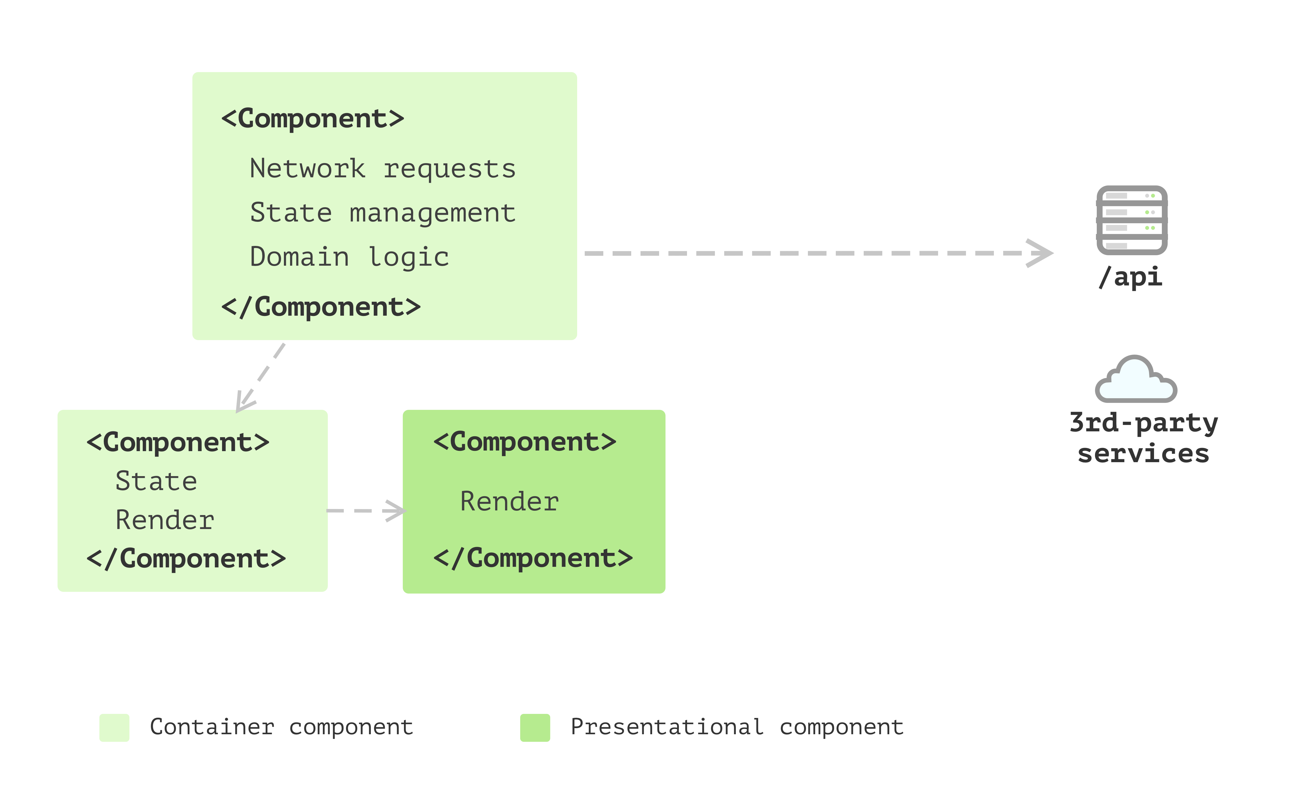 More often than not, people squeeze different things into React components or hooks to make the application work. This type of less-organised structure isn't a problem if the application is small or mostly without much business logic. However, as more business logic shifted to front-end in many cases, this everything-in-component shows problems. To be more specific, the effort of understanding such type of code is relatively high, as well as the increased risk to code modification.